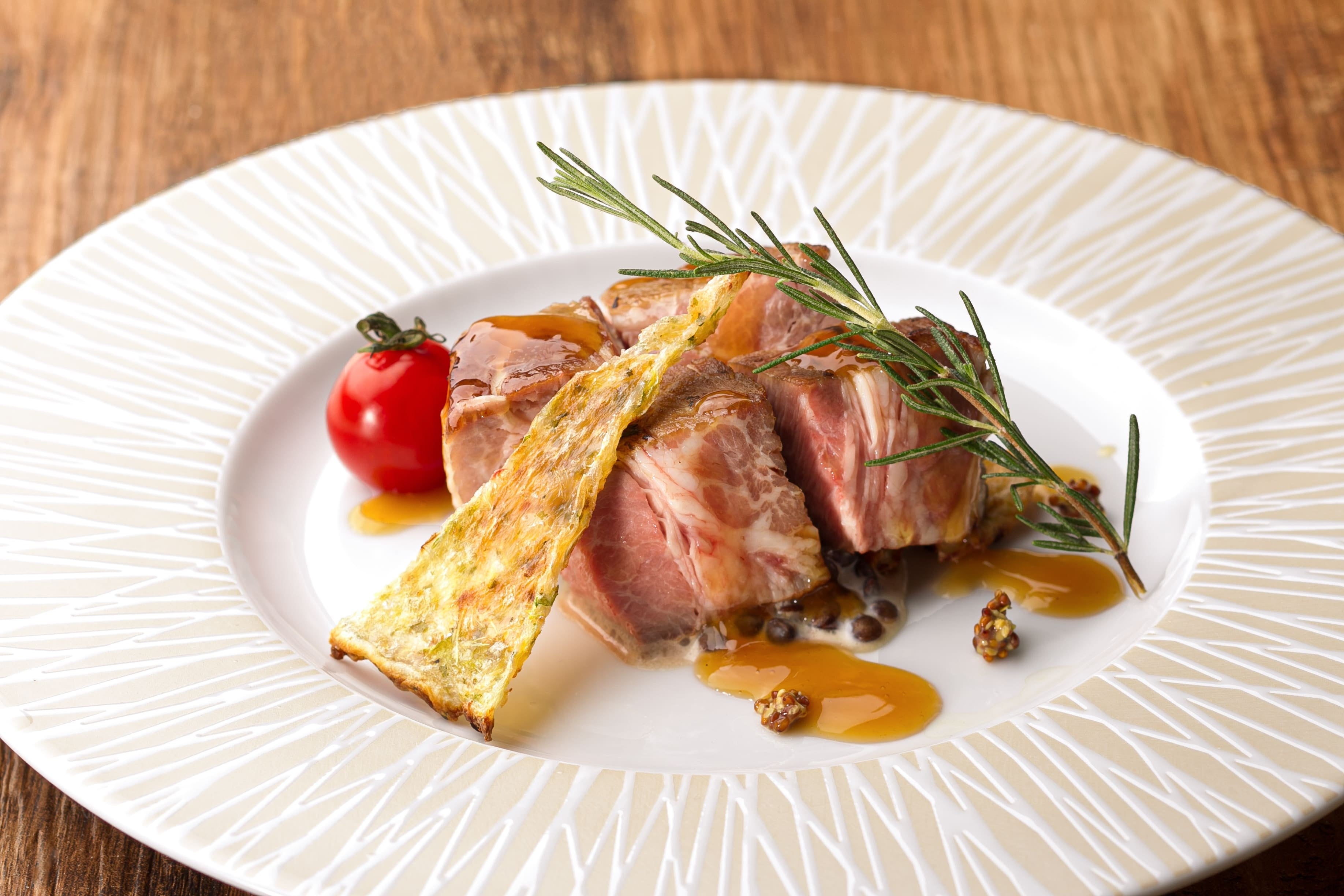 右下)選べるランチのオススメメイン「広島県産ブランド穀美豚のコンフィ」