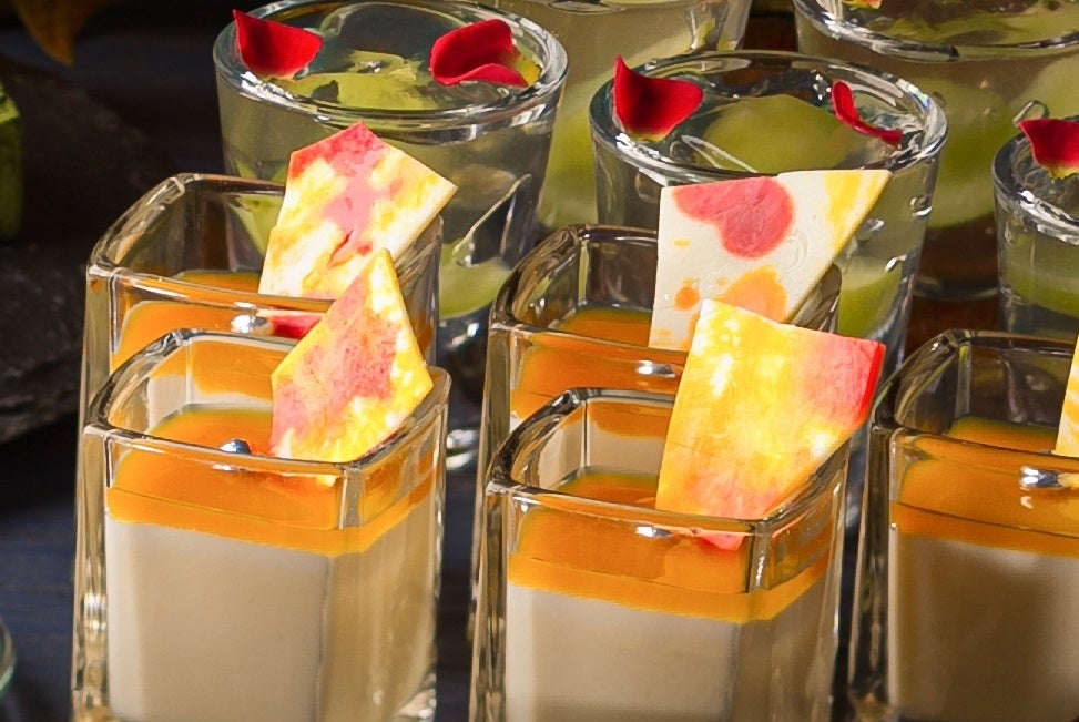 右上)酸味のきいたパッションフルーツソースを合わせた柔らかな甘みの「ホワイトチョコムース」