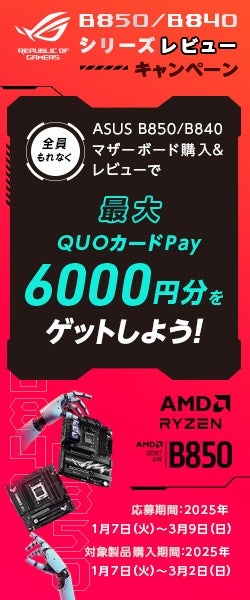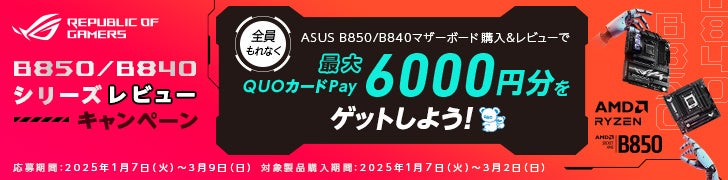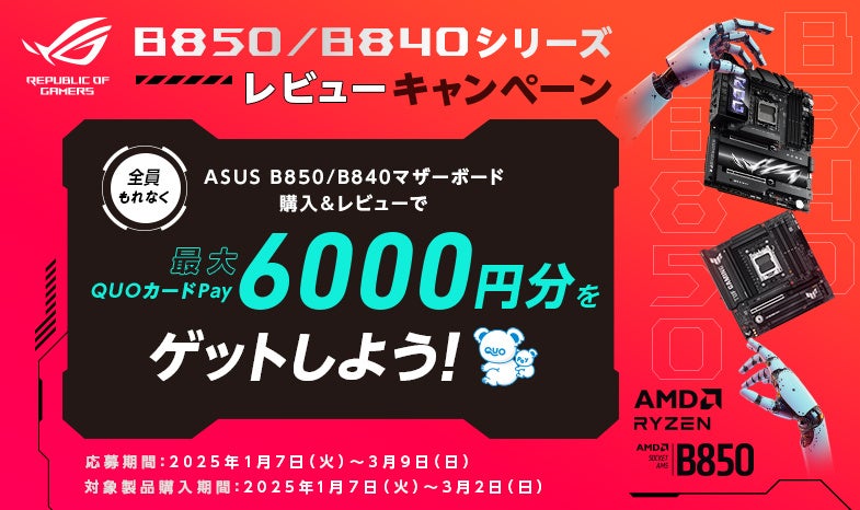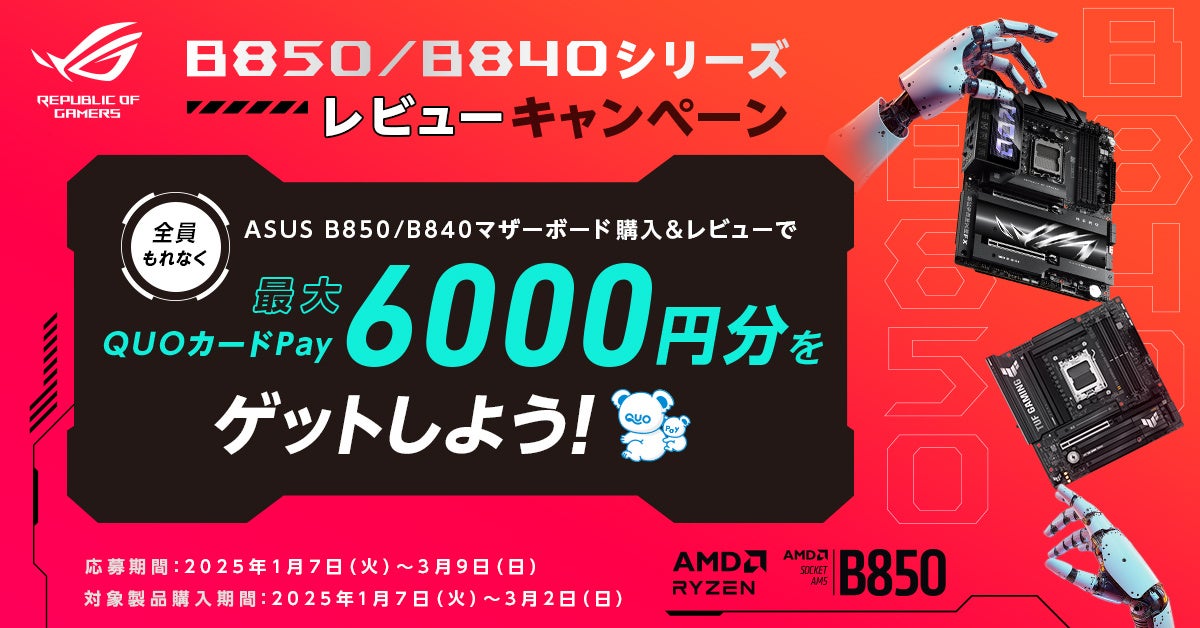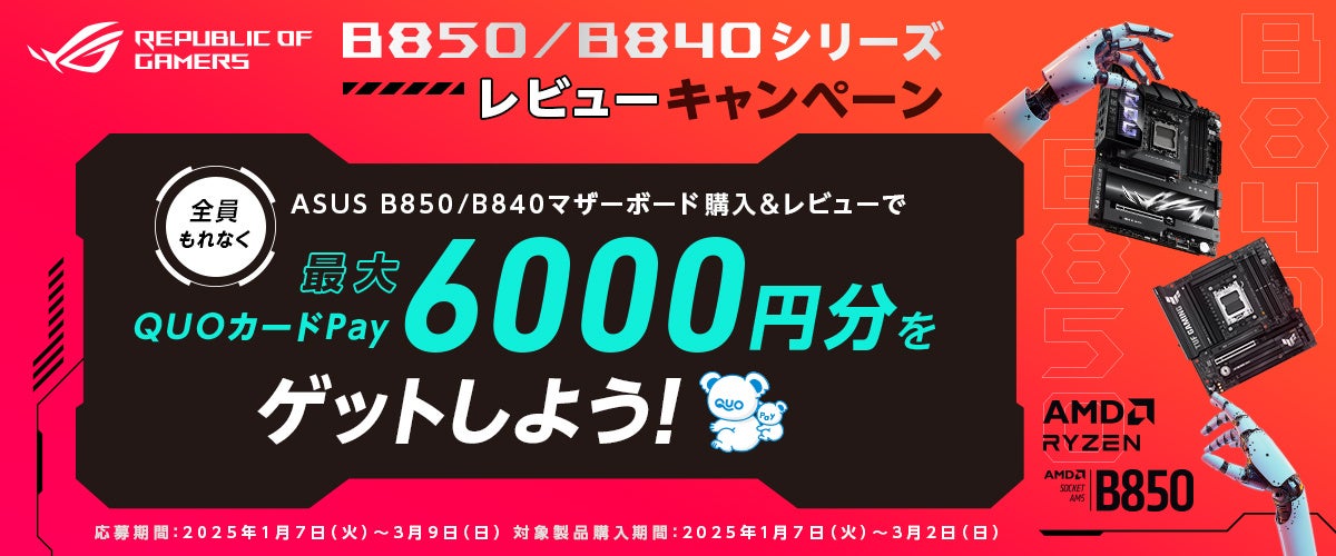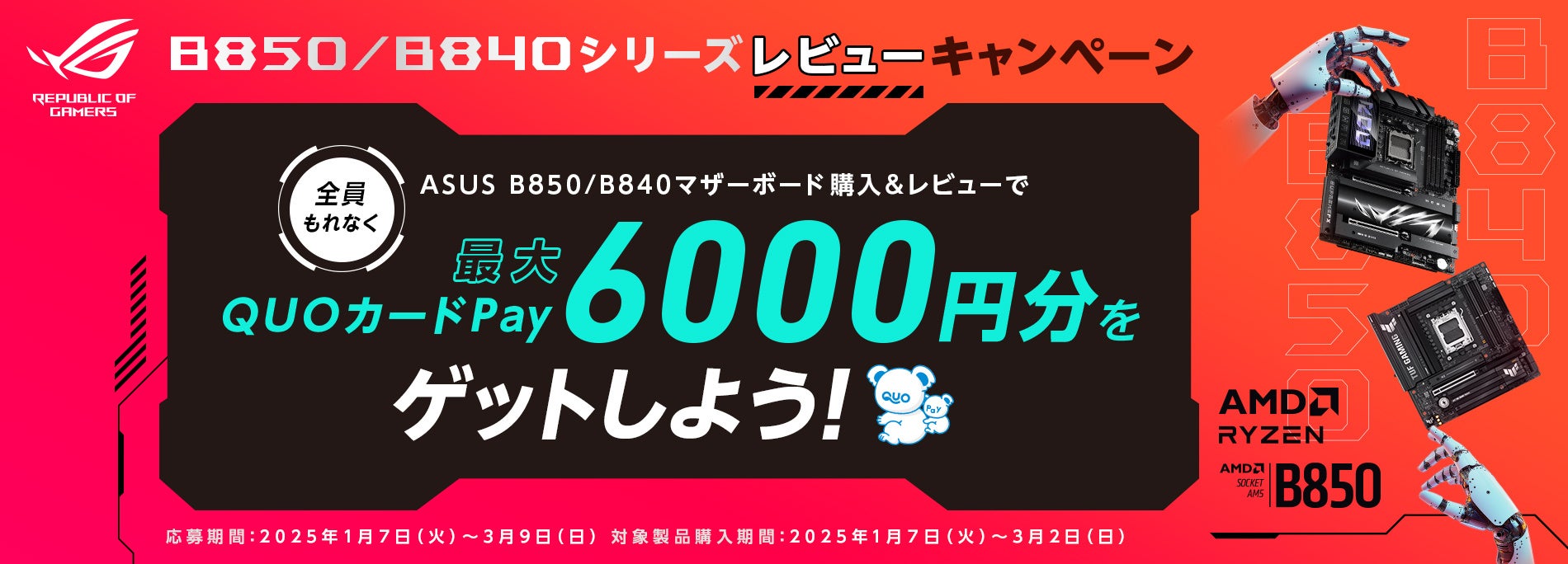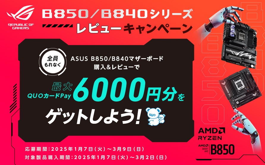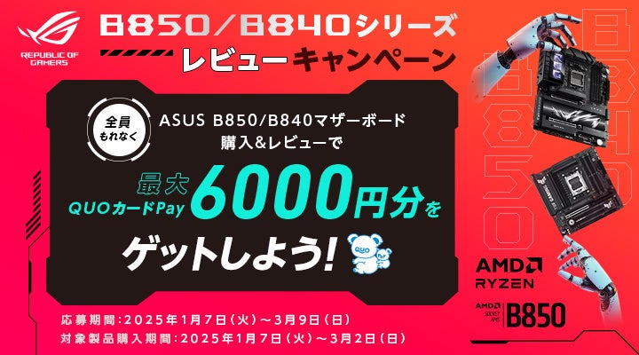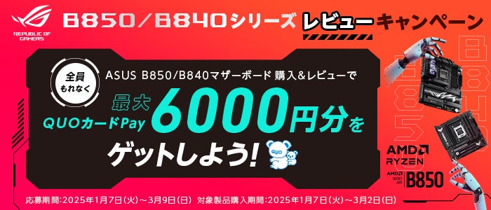 ASUS JAPAN株式会社は、AMD B850/B840シリーズのマザーボードを期間内に購入しレビューをしたいただくと、全員にもれなく最大6000円分のQUOカードPayをプレゼントするキャンペーンを2025年1月7日(火)より開催します。