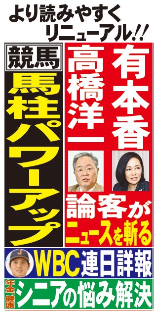 夕刊フジ(産経新聞社発行)が、春の紙面刷新―より読みやすく、紙面レイアウトをリニューアルします。読者に好評のレギュラー連載陣、高橋洋一、有本香、須田慎一郎らの論客が、話題のニュースを解説。花田紀凱や大鶴義丹、室井滋、久住昌之らの人気エッセーも満載です。読めばスコアアップ、最新理論のゴルフレッスンを毎日掲載。週末の競馬面では、馬柱がバージョンアップし、馬券予想の強い味方に。健康や財テクなど、シニアの悩みを解決する企画も、ますます充実しました。駅売店やコンビニで、リニューアルされた夕刊フジ(税込み180円)を、ぜひお買い求めください。