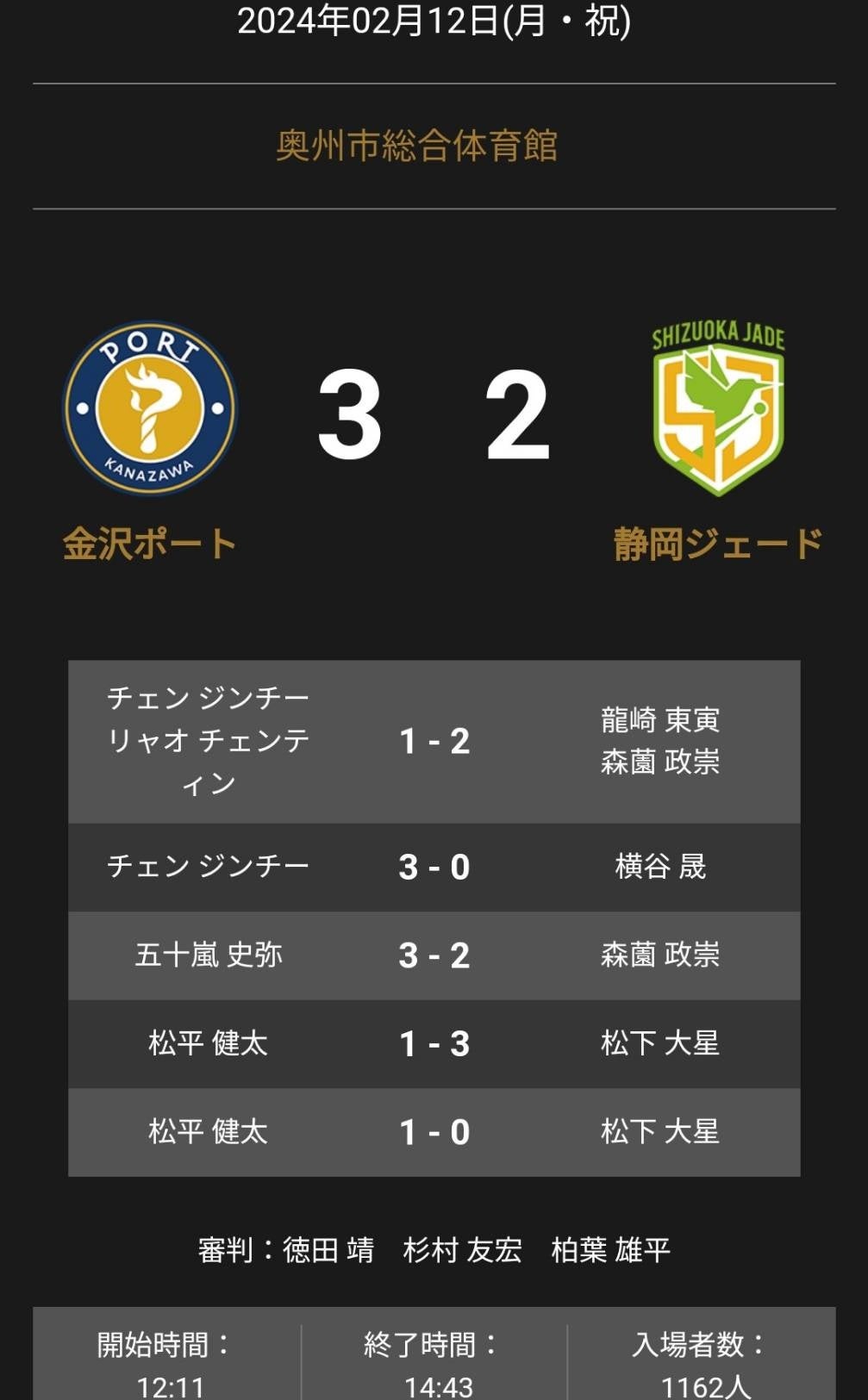 金沢ポートと静岡ジェードの試合は、3-2で金沢ポートが勝利しました。
