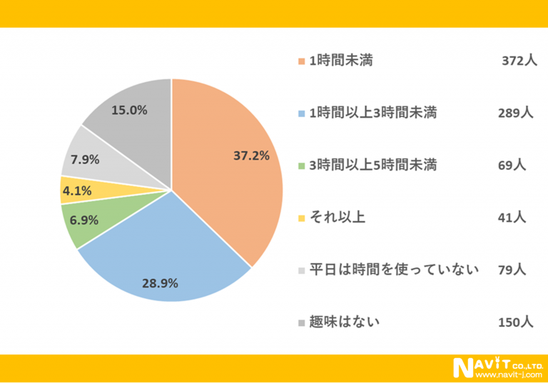「平日、趣味にどれくらいの時間をかけていますか?」という質問については、「1時間未満」が37.2%、「1時間以上3時間未満」が28.9%、「3直に畳5時間未満」が6.9%という順になりました。