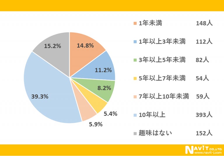 趣味の継続時間については、「10年以上」が39.3%、「1年未満」が14.8%、「1年以上3年未満」が11.2%、という順になりました。