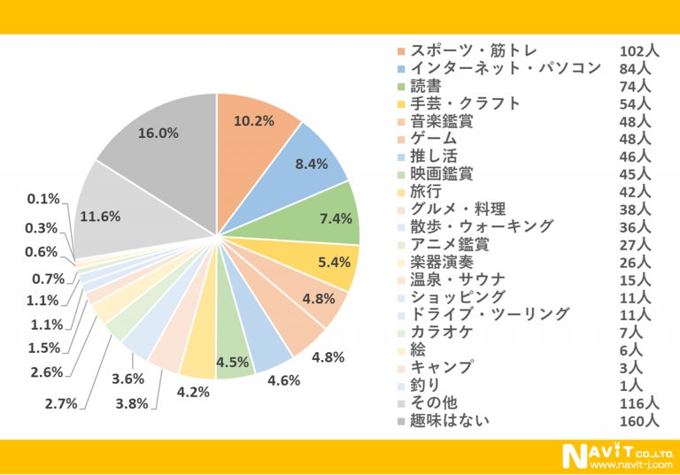「今、最も熱中している趣味は何ですか?」という質問については、「スポーツ・筋トレ」が10.2%、「インターネット・パソコン」が8.4%、「読書」が7.4%という順になりました。