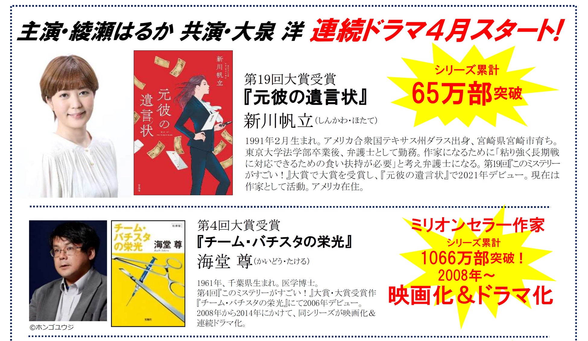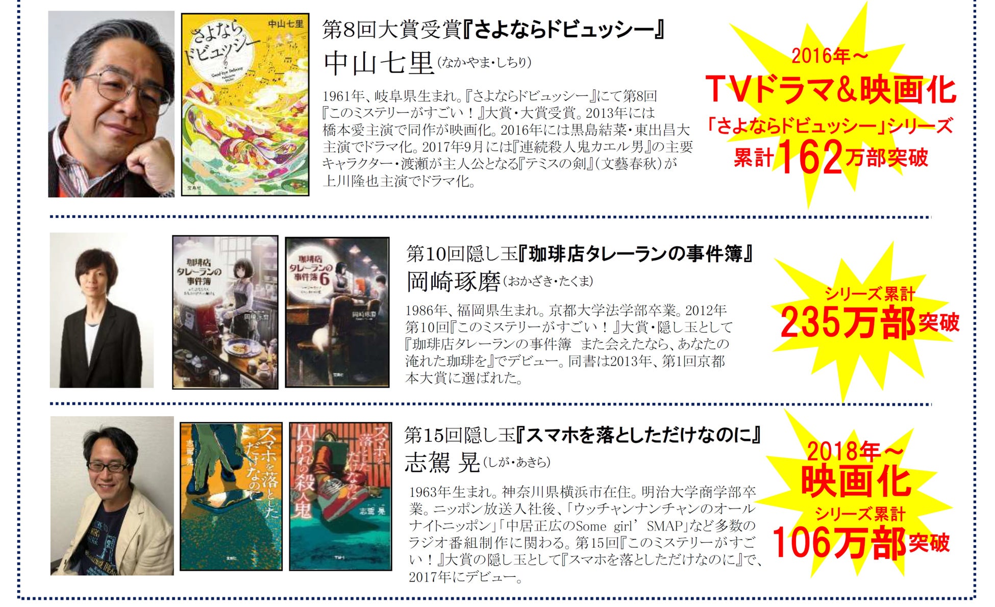 『このミステリーがすごい!』大賞は、ミステリー&エンターテインメント作家・作品の発掘・育成を目的に、2002年に創設した新人賞です。これまで、第153回直木賞受賞者の東山彰良氏や、累計1066万部突破の『チーム・バチスタの栄光』シリーズの海堂尊氏、音楽ミステリー『さよならドビュッシー』や社会派ミステリー『護られなかった者たちへ』で知られる中山七里氏などの作家を輩出してきました。また、志駕晃氏の『スマホを落としただけなのに』シリーズなど、映像化作品も多数世に送り出してい ます。さらに、受賞には及ばなかったものの、将来性を感じる作品を「隠し玉」として書籍化。岡崎琢磨氏の『珈琲店タレーランの事件簿』シリーズをはじめ、「隠し玉」からもベストセラー作品が多く生まれています。