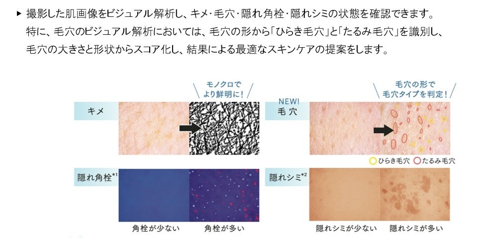 「スキンチェックスコープ」は、お客様の肌表面を自動で撮影し、当社が考える素肌美の重要な4要素である「うるおい」「キメ」「ハリ」「透明感」の状態を数値化し、お客様の「今」の肌のバランスを明らかにすることができます。さらに肌表面の画像を詳しく解析することで、「キメ」「毛穴」「隠れ角栓*1」「隠れシミ*2」の状況を従来よりも詳細に把握することが可能となりました。これにより、肌状態の変化を継続的に把握でき、日常的なスキンケアの改善や見直しに活用していただけます。