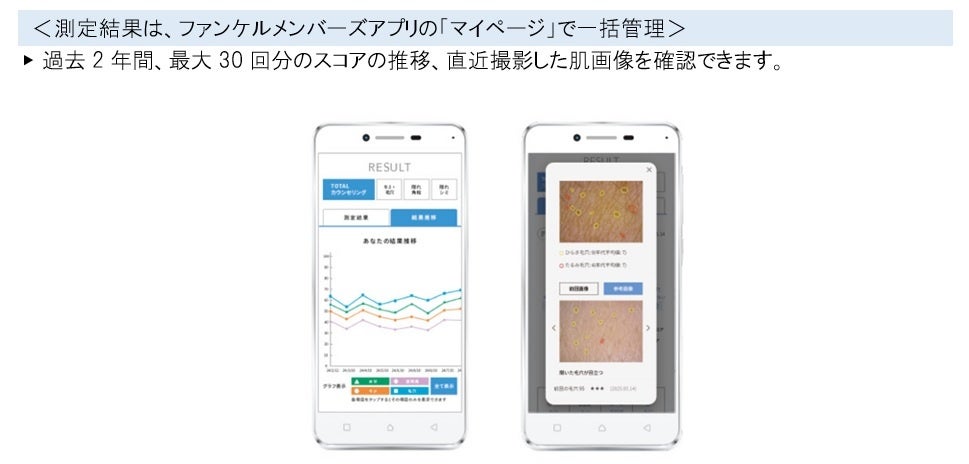 従来の肌解析に約3分かかっていた時間を10秒と大幅な短縮や解析項目を追加し、簡便さと精度を兼ね備えた次世代の肌解析を実現します。また、当社が運営する「ファンケルメンバーズアプリ」と連携し、お客様がご自身のアカウント内「マイページ」からいつでも結果を確認することができるようになりました。