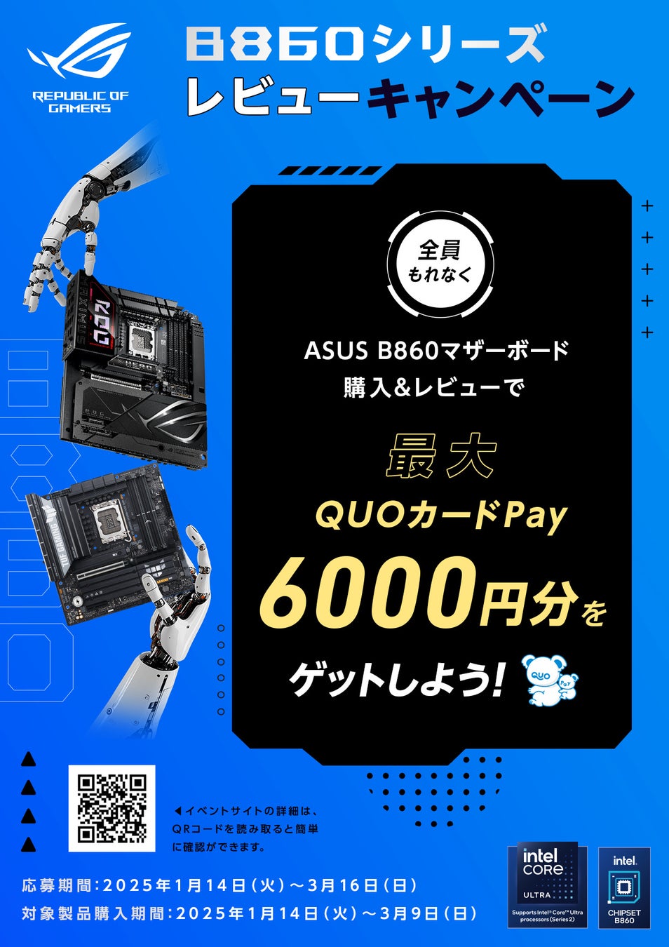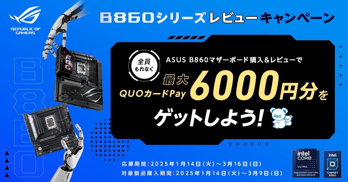 ASUS JAPAN株式会社は、Intel B860シリーズのマザーボードを期間内に購入しレビューをしたいただくと、全員にもれなく最大6000円分のQUOカードPayをプレゼントするキャンペーンを2025年1月14日(火)より開催します。