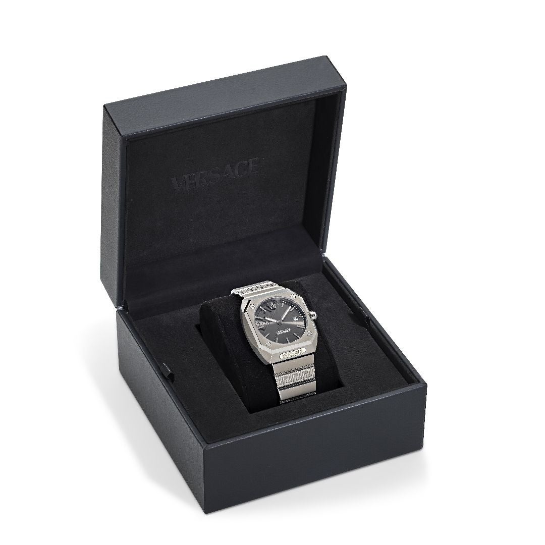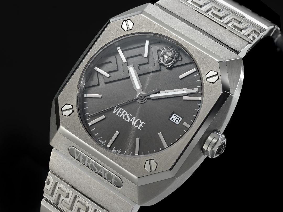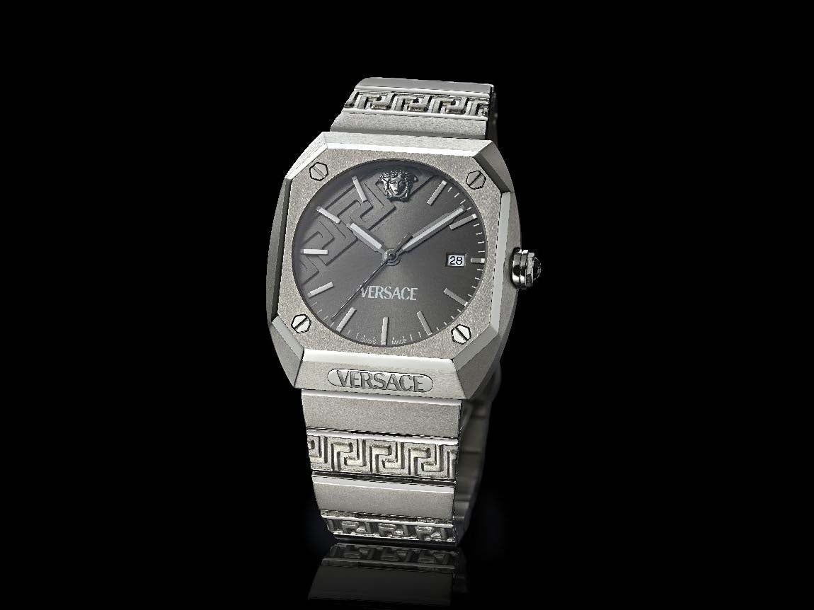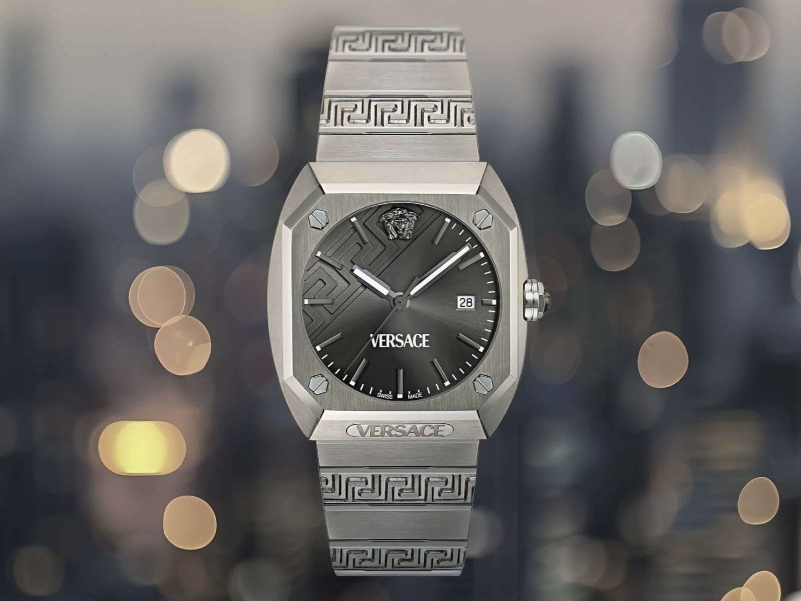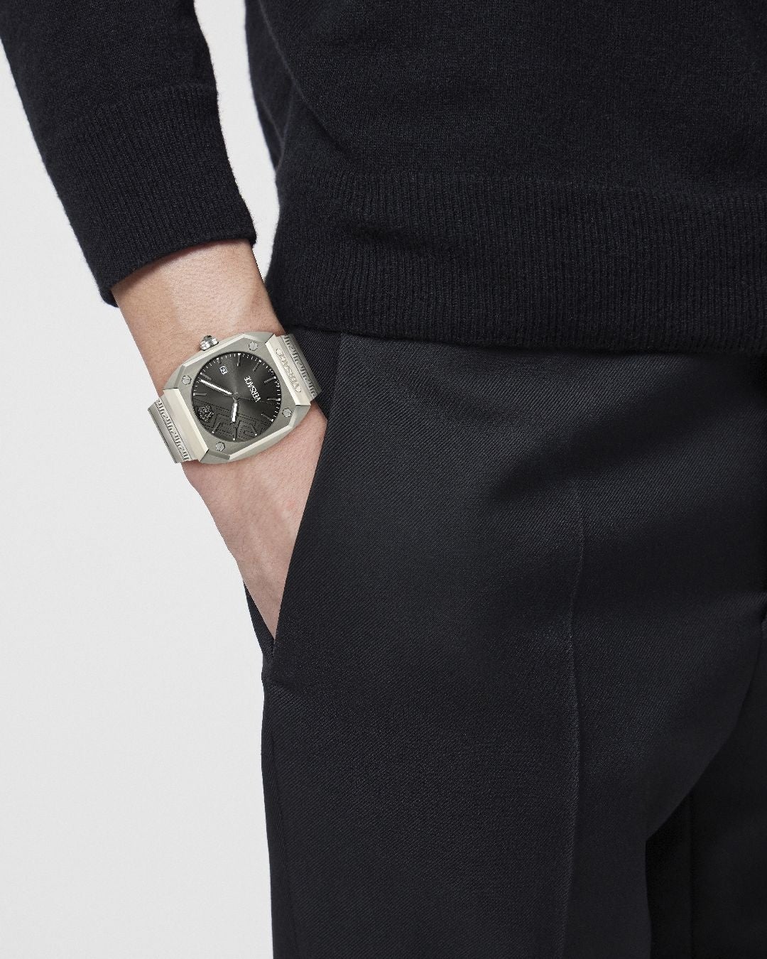 文字盤にはブランドのシグネチャーの1つであるグレカパターンが深く刻まれ、ブレスレットにも同様に繰り返されています。12時位置にはブランドを象徴するメドゥーサが鎮座しています。ヴェルサーチェの革新的なデザイン、時代を超えたエレガンス、そして職人技へのリスペクトを余すところなく表現しています。