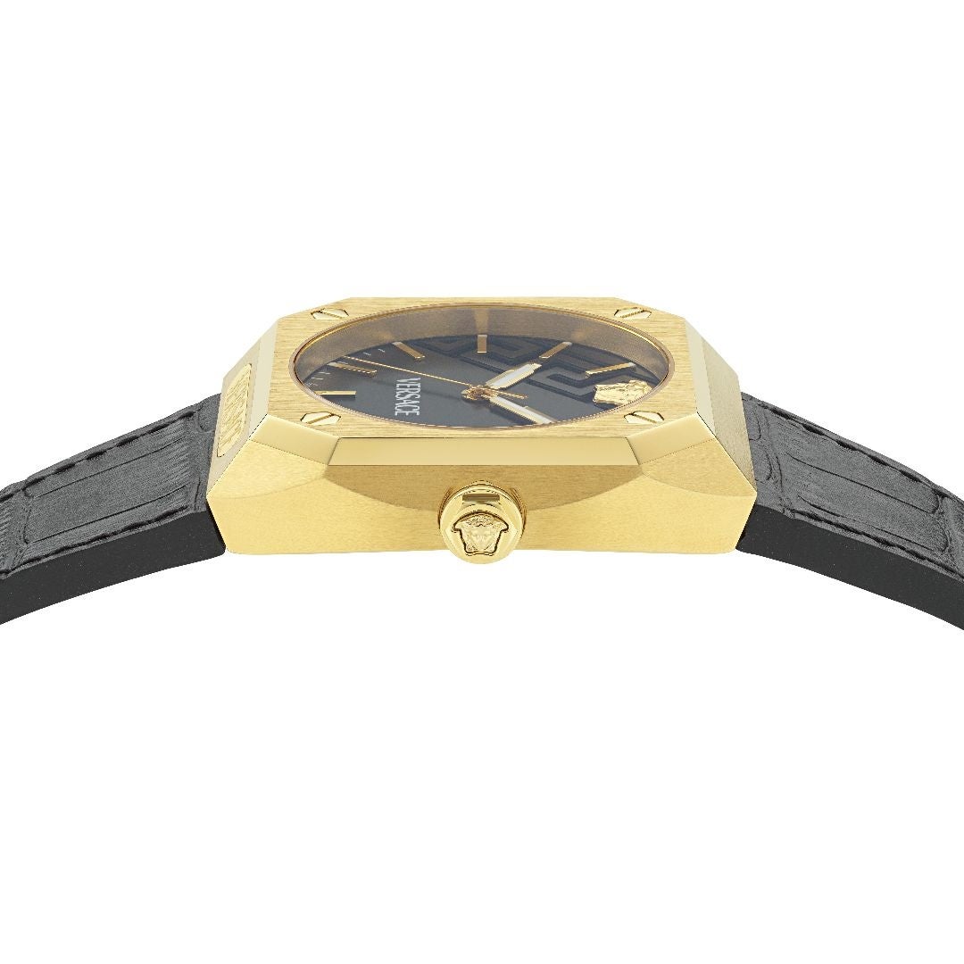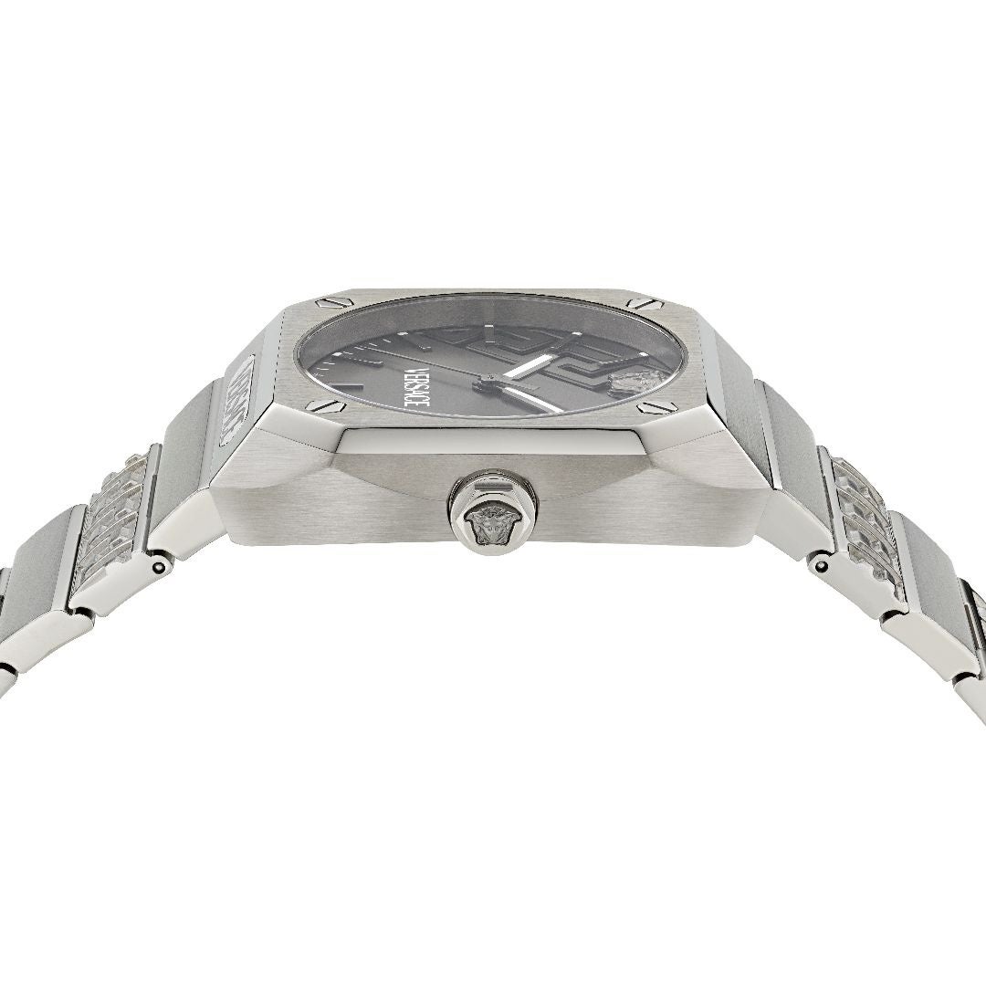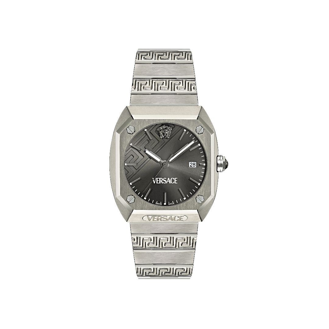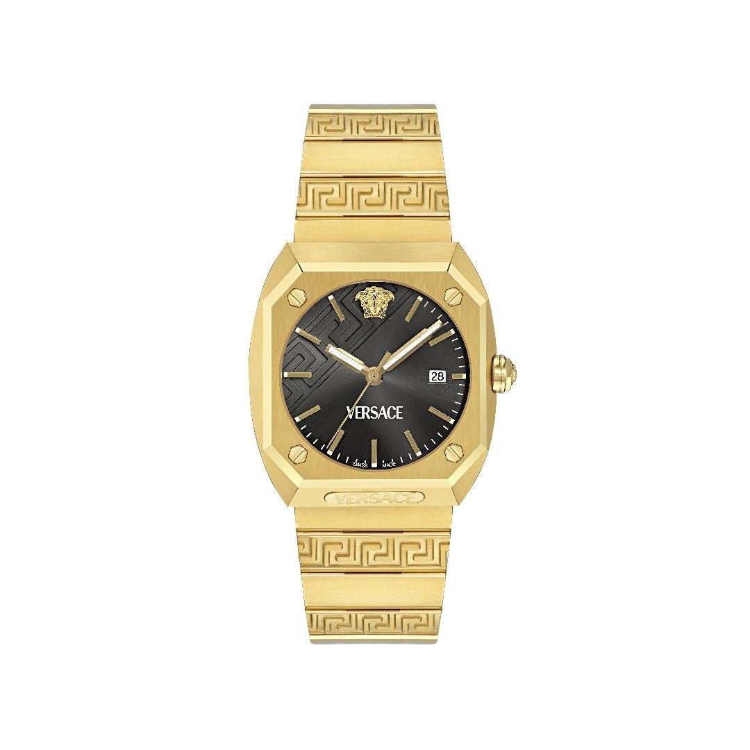文字盤にはブランドのシグネチャーの1つであるグレカパターンが深く刻まれ、ブレスレットにも同様に繰り返されています。12時位置にはブランドを象徴するメドゥーサが鎮座しています。ヴェルサーチェの革新的なデザイン、時代を超えたエレガンス、そして職人技へのリスペクトを余すところなく表現しています。