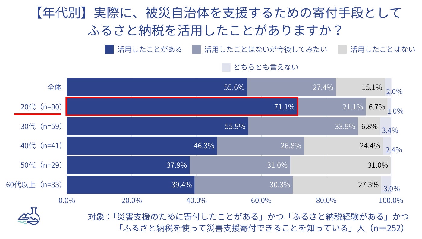 ふるさと納税で被災自治体に寄付できることを知っているのは全体の47.4%。災害支援寄付経験がある人に絞ると、実際にふるさと納税で寄付したことがある人は55.6%で、「ふるさと納税で寄付したことはないが今後は活用してみたい」と答えた人は27.4%。