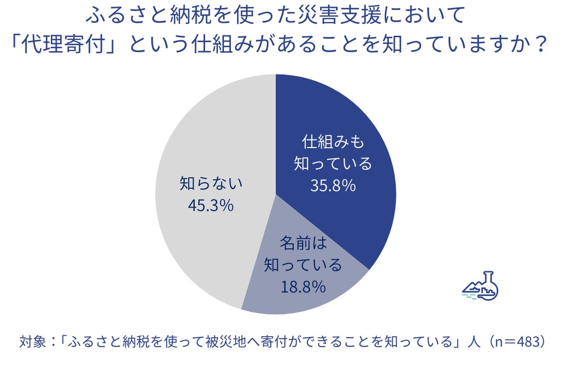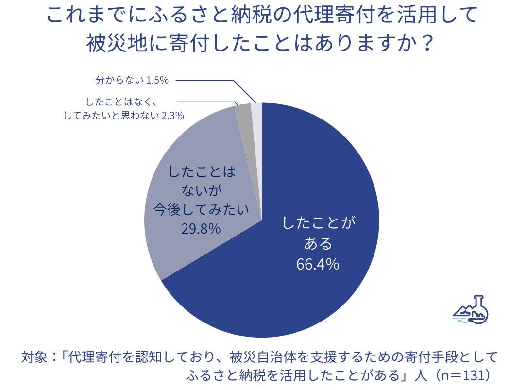 ふるさと納税で被災自治体に寄付できることを知っている人のうち、代理寄付という仕組みがあることを「知っている」人が35.8%、「仕組みは知らないが名前は知っている」という人が18.8%。仕組みを知っていると回答した人のうち、「代理寄付を活用して被災地に寄付したことがある」という回答が66.4%、「したことはないが今後してみたい」が29.8%となった。