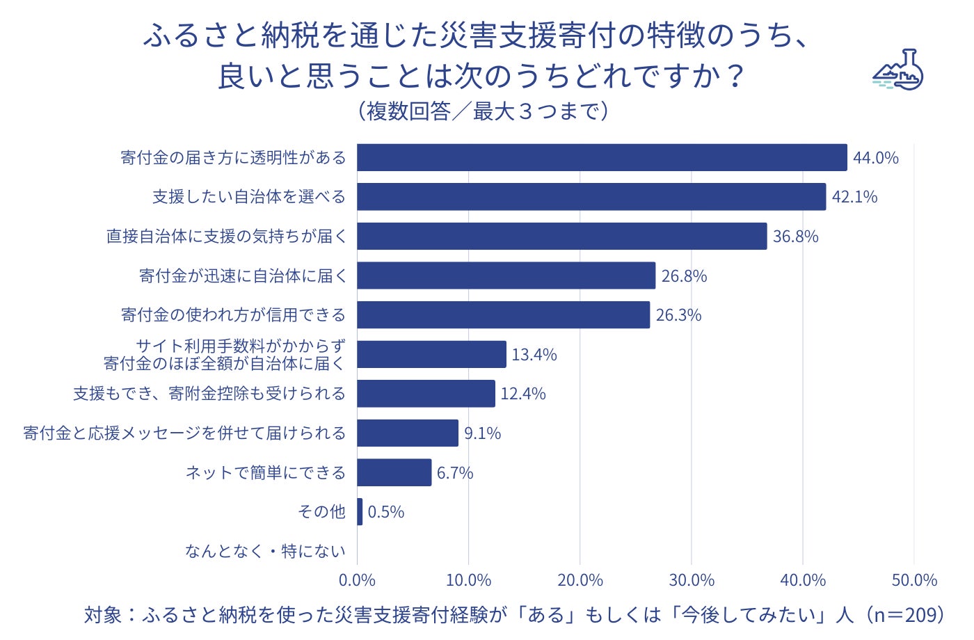 ふるさと納税による災害支援寄付の「良い」と思う特徴は「寄付金の届き方に透明性がある」44.0%が最も支持された。ほぼ並んで「支援したい自治体を選べる」42.1%も評価されたほか、「直接自治体に支援の気持ちが届く」「寄付金が迅速に自治体に届く」「寄付金の使われ方が信用できる」も回答を集めた。