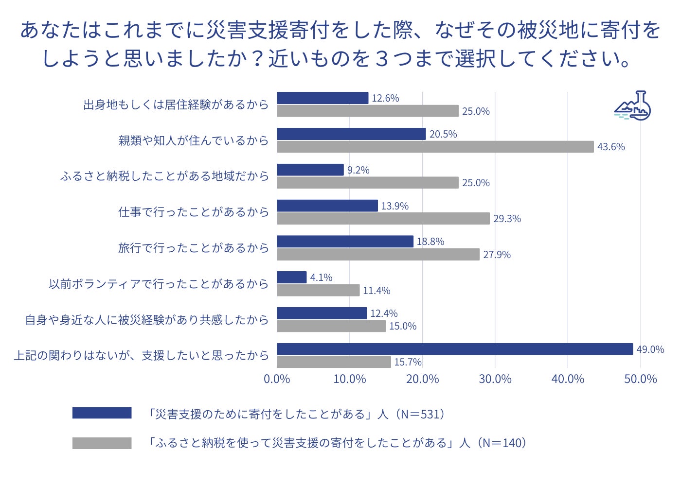 被災地に寄付しようと思った理由は、最多が「(特段その地域との)関わりはないが、支援したいと思ったから」が49.0%。また、ふるさと納税での災害支援寄付経験者は、寄付をした地域との関わりを理由に挙げた人が多く「親類や知人が住んでいるから」が43.6%、「仕事で行ったことがあるから」が29.3%、「旅行で行ったことがあるから」が27.9%という結果となった。