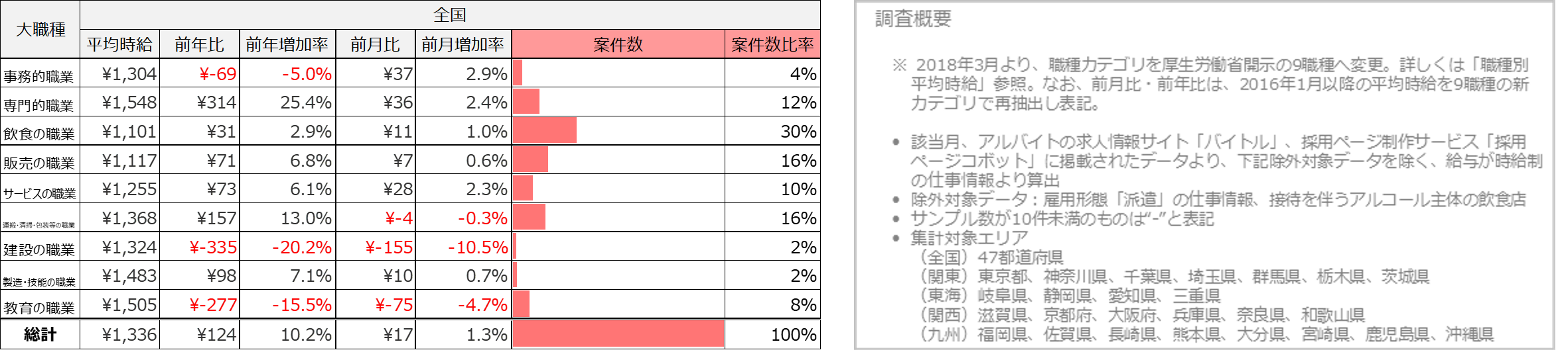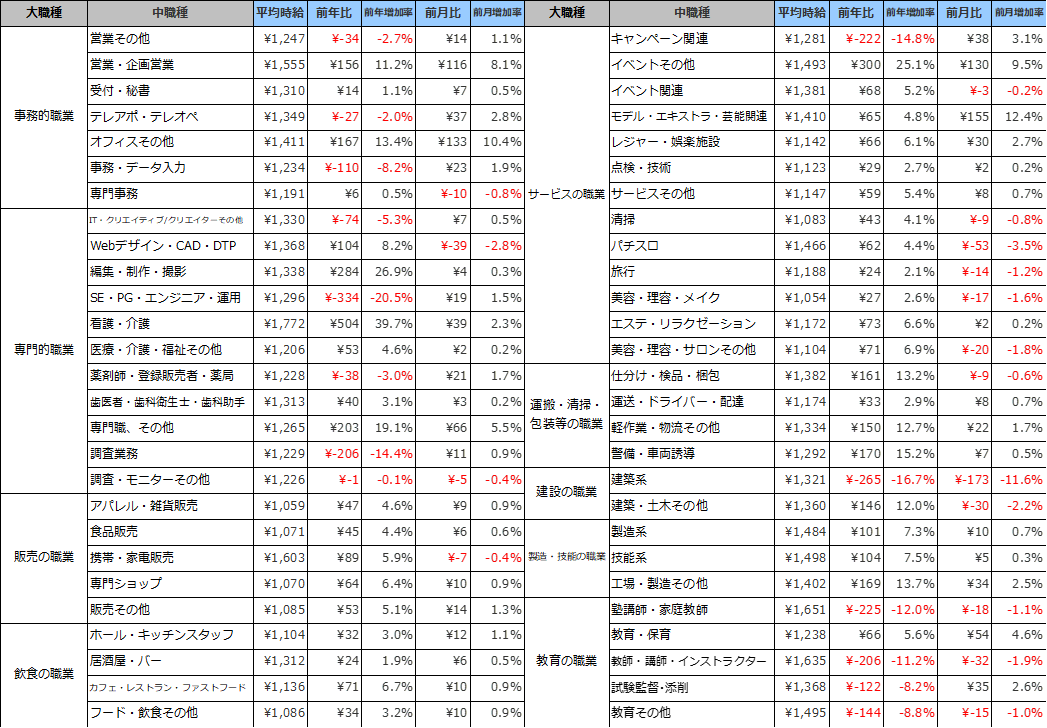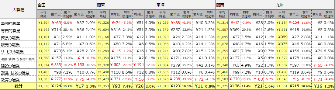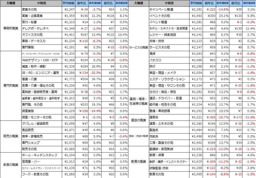 職種別の平均時給は、9職種中6職種の大カテゴリが前年を上回りました。事務的職業は1,304円(前年比69円減、前月比37円増)、専門的職業は1,548円(前年比314円増、前月比36円増)、飲食の職業は1,101円(前年比31円増、前月比11円増)、販売の職業は1,117円(前年比71円増、前月比7円増)、サービスの職業は1,255円(前年比73円増、前月比28円増)、運搬・清掃・包装等の職業は1,368円(前年比157円増、前月比4円減)、建設の職業は1,324円(前年比335円減、前月比155円減)、製造・技能の職業は1,483円(前年比98円増、前月比10円増)、教育の職業は1,505円(前年比277円減、前月比75円減)となりました。
