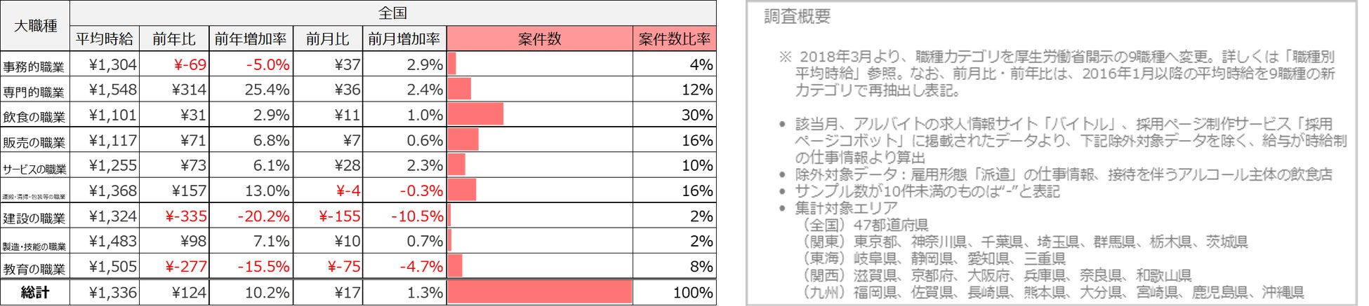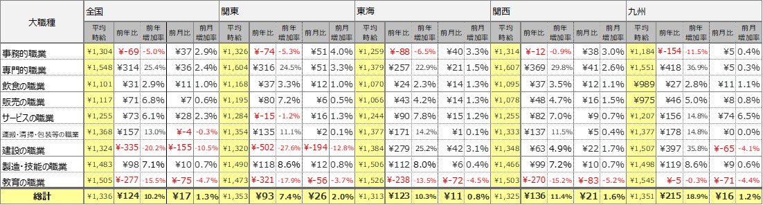 関東エリアの平均時給は1,353円(前年比93円増、前月比26円増)、東海エリアの平均時給は1,313円(前年比123円増、前月比11円増)、関西エリアの平均時給は1,325円(前年比136円増、前月比21円増)、九州エリアの平均時給は1,351円(前年比215円増、前月比16円増)となりました。