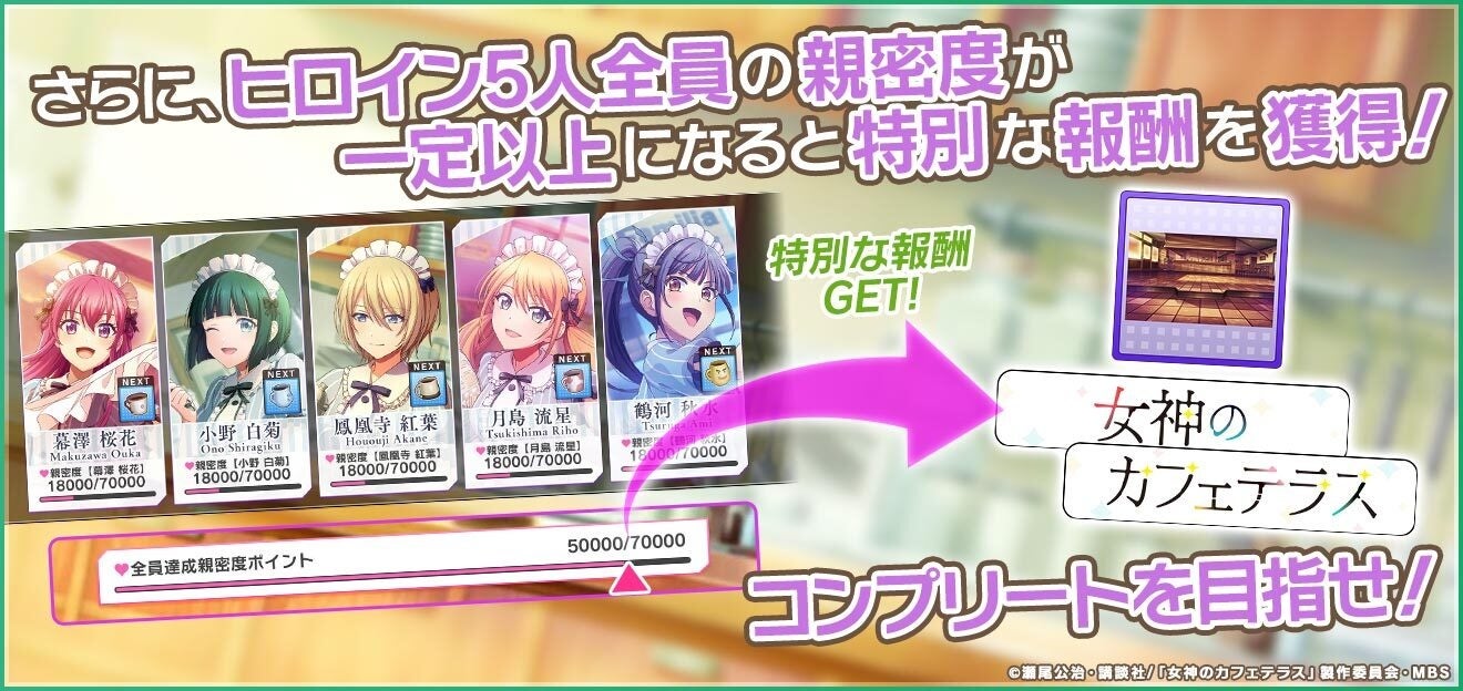 本イベントでは、応援ライブを行うことで『女神のカフェテラス』に登場するヒロインたちの親密度を上げることができ、親密度が一定以上になると特別な報酬を獲得することができます。