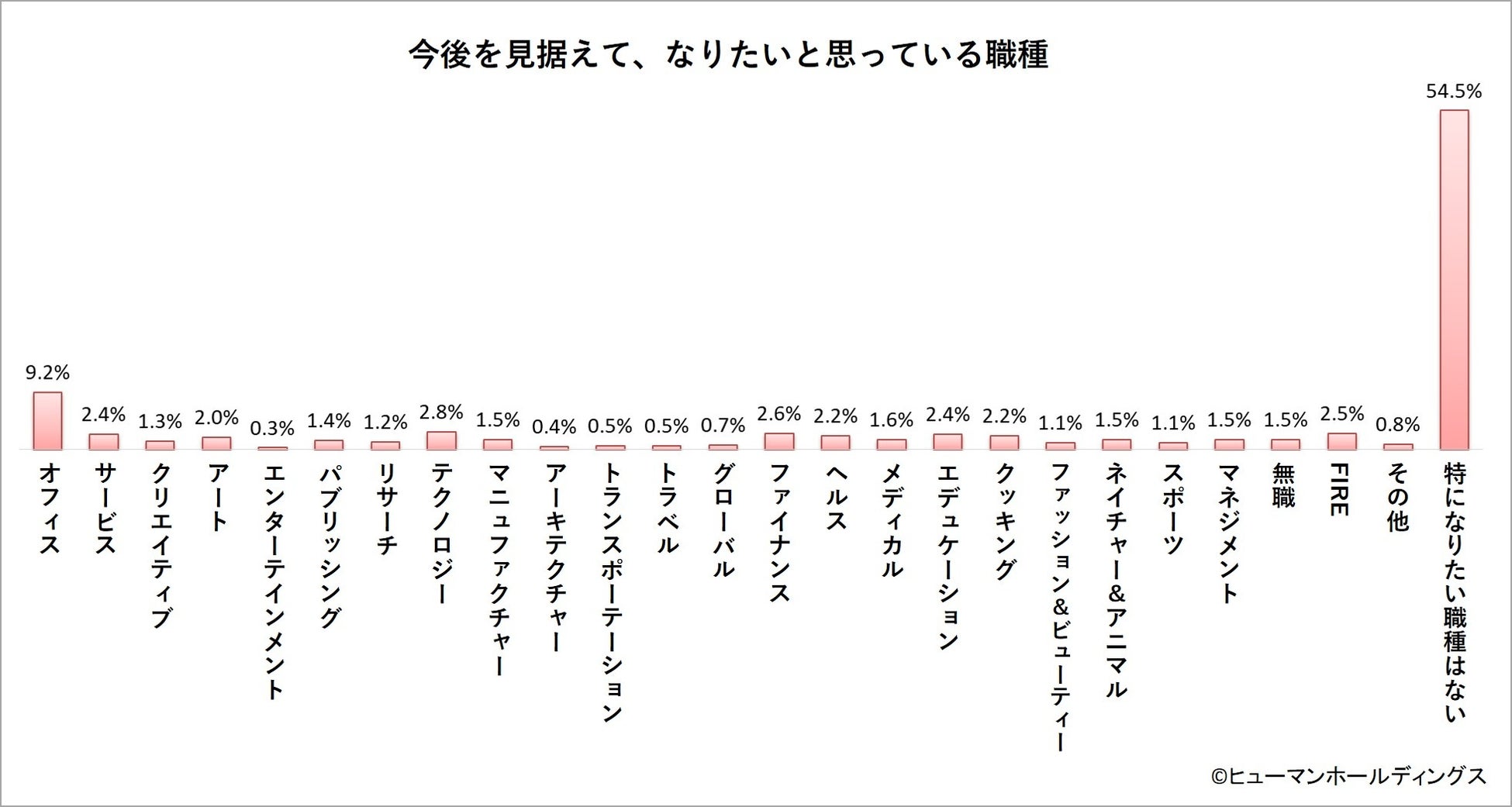 「今後を見据えて、なりたいと思っている職種」の有無(有:「今、就業している職種を前向きな理由で続けていきたいと考えている」を含む)について質問したところ、54.5%の人が「特になりたい職種はない」と回答しました。