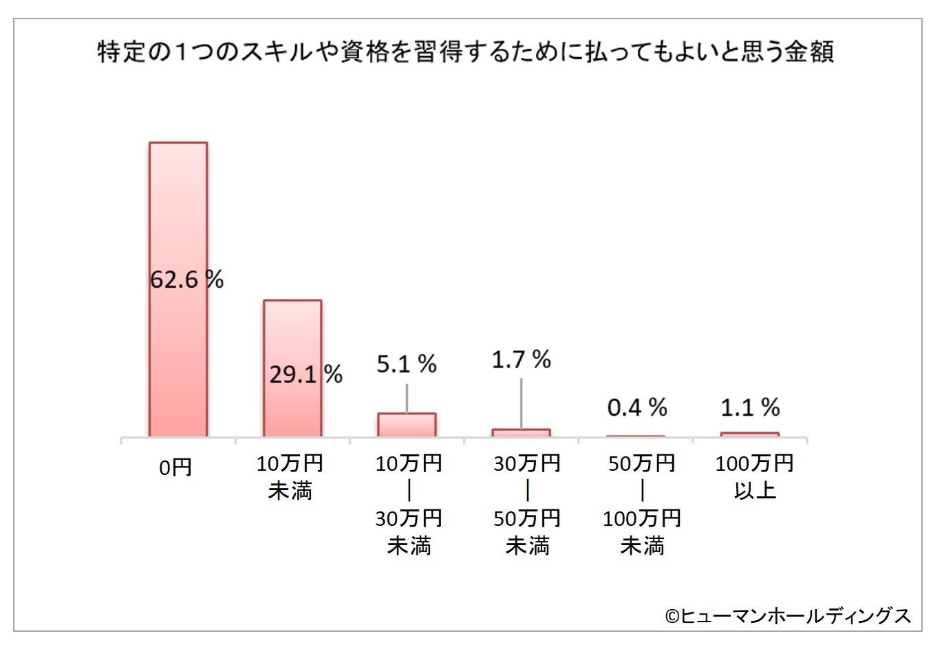 | ●40~59歳男女の62.6%が、特定のスキルや資格を習得するために払ってもよい費用は「0円」 ●40~59歳男女の54.5%が、「特になりたい職種はない」 ●40~59歳男女が今後、なりたいと思う職種の1位「オフィス(会社員など、企業や団体の一員として働く)」系、2位「テクノロジー」系、3位「ファイナンス」系 |