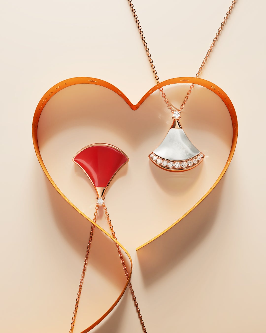 ブルガリの厳選されたコレクションは、この希少で高貴な力を表現する完璧なギフトとして、人と人を結びつける喜びと活力に満ちたエネルギーを体現しています。ジュエリーでは、ピンクゴールドの洗練された「ディーヴァ ドリーム」のネックレスが、アイコニックなシェイプのペンダントにカーネリアンとマザー・オブ・パールを優美にセッティングし、愛を祝福します。ブルガリのローマの伝統に根ざした本コレクションの美しいシグネチャーは、高貴なパヴェダイヤモンドで飾られ、優雅で時代を超越したエレガンスを表現しています。さらに、エッセンシャルでありながら個性的な「ビー・ゼロワン」のブレスレットやアイコニックなリングや魅惑的な「セルペンティ」コレクションのジュエリーは、今年のヴァレンタインデーに意味深い愛の告白を繰り広げます。