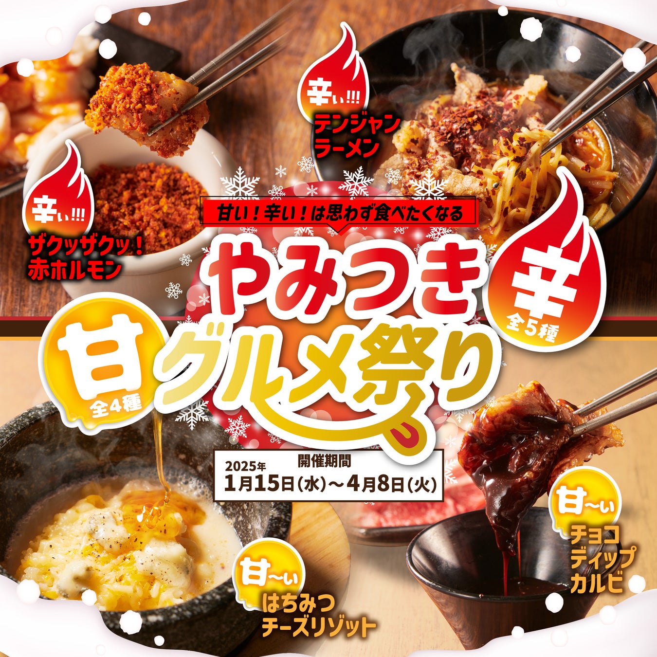 ワタミ株式会社(東京都大田区、以下ワタミ)と国内有数の和牛生産者であるカミチクグループ(鹿児島県鹿児島市)との合弁会社、ワタミカミチク株式会社(東京都大田区、以下ワタミカミチク)が展開する「かみむら牧場」は、2025年1月15日(水)から期間限定で、「やみつきグルメ祭り」として「チョコ・ディップ・カルビ」や「はちみつチーズリゾット」など4種の「甘いモノ」メニューと、「ザクッザクッ!赤ホルモン」や「テンジャンラーメン」など5種の「辛いモノ」メニューを「ジャストミートコース」以上の食べ放題コースで提供いたします。