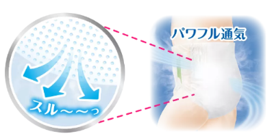 ・シート表面には目には見えない穴が50億個以上*1 ある全面通気シートを搭載。毛穴より微細な約50億個の穴からパワフル通気。おしっこ後もずっと肌さらが続きます。
