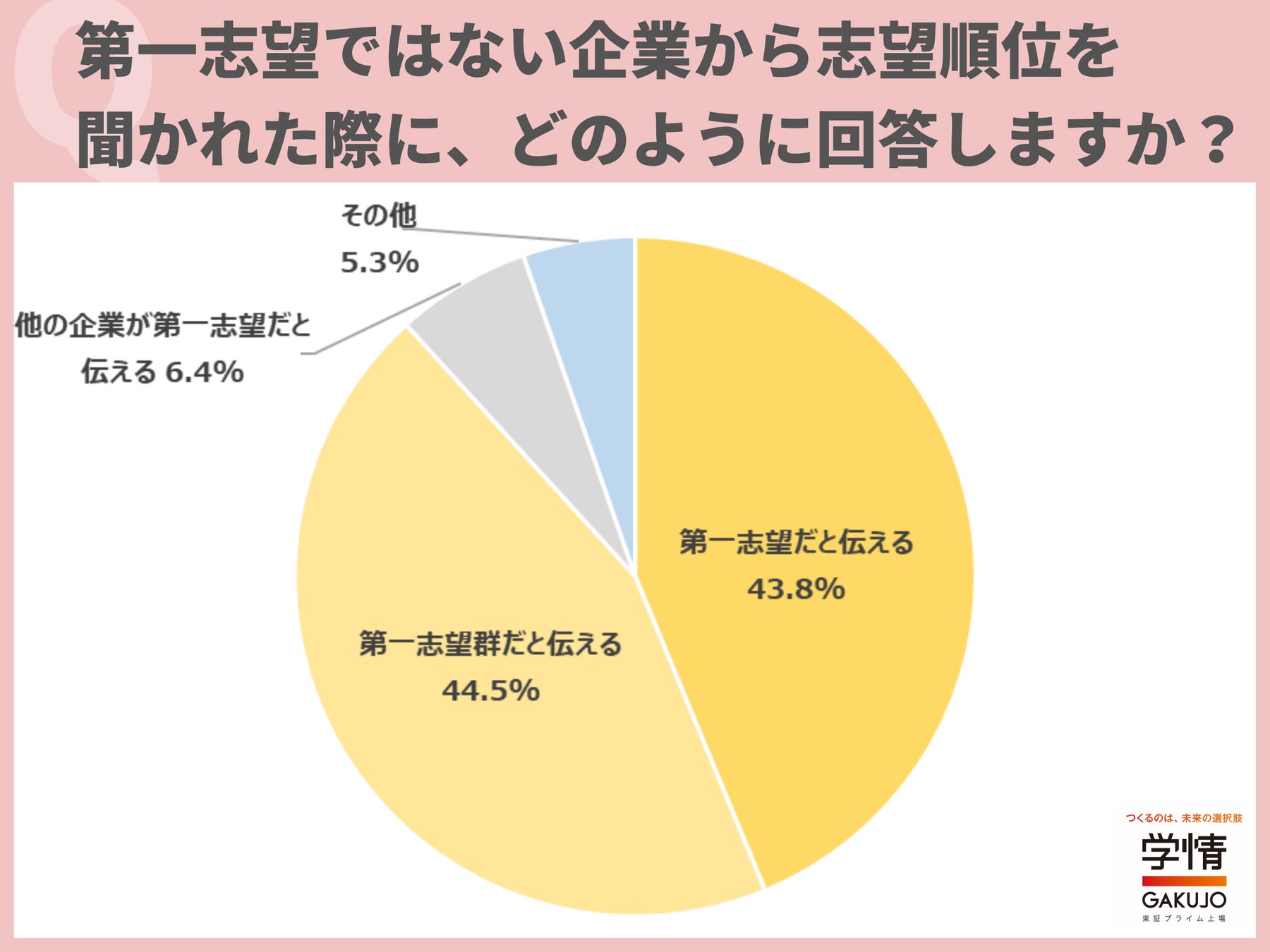 第一志望ではない企業から志望順位を聞かれた際に、「第一志望群」と伝える学生が44.5%を占め、「第一志望だと伝える」との回答43.8%を上回りました。「第一志望だと伝える」と回答した学生からは、「やる気を見せたい」「志望度が高いほうが受かりやすいと思う」「そう答えないと落ちる」「それがマナーだと思う」などの声が寄せられました。一方、「第一志望群だと伝える」と答えた学生からは、「嘘にならず、かといって先方を不快にさせにくそう」「企業に対して興味を持ち、真剣に選考を受けていることを示すため」「自分の就活の基準に合っていれば内定をいただきたいため」といった声が上がりました。