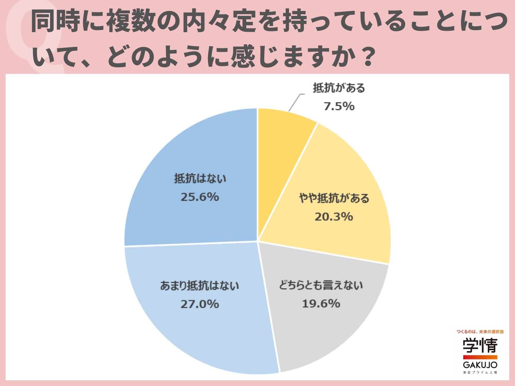 同時に複数の内々定を持っていることについて、「抵抗はない」と回答した学生が「あまり抵抗はない」と合わせて52.6%で過半数を占めました。「内定はあればあるほどいい」「比較検討できる方がいい」「自分のキャリアを慎重に選択するためには、複数の選択肢を持つことが重要」などの声が上がりました。「抵抗がある」7.5%と「やや抵抗がある」20.3%を合わせると、3割弱でした。「不義理であるように感じる」「嘘をついたことの罪悪感」「企業に申し訳なく感じる」などの声が寄せられています。