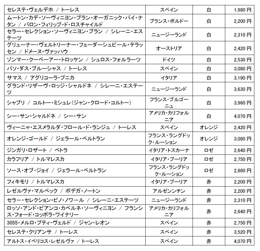 第1回目は「夏と音楽とワイン」をテーマに、スパークリングワイン6種・白ワイン12種・オレンジワイン2種・ロゼワイン3種・赤ワイン7種の全30種類のワインを自由に楽しむことができます。ワインはシャンパンやスペインのカヴァをはじめとしたスパークリングワイン、シャブリやボルドーのソーヴィニヨン・ブランといったすっきりとした白ワイン、南イタリアやカリフォルニアの冷やしておいしい赤ワインなど暑い季節に合った銘柄を取りそろえました。