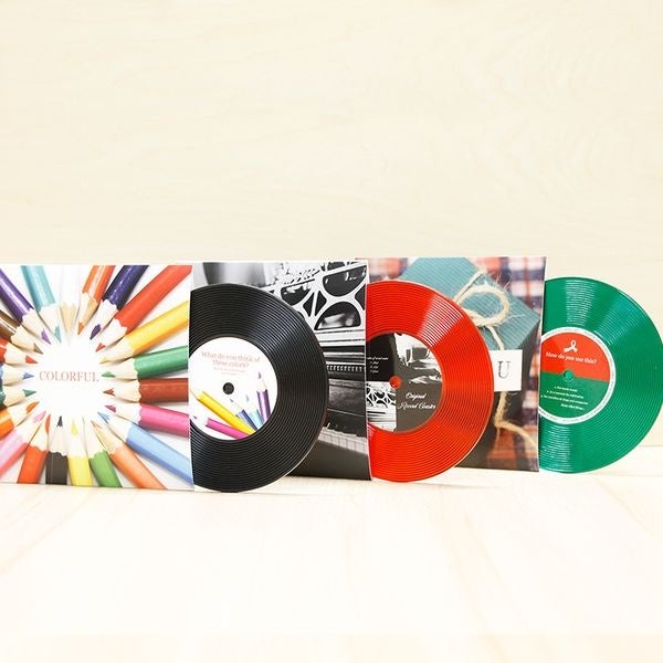 1960~80年代にかけ日本でも多く市場に出ていた塩化ビニール製のカラフルなレコード盤「ソノシート」を彷彿とさせるコースター。ジャケットに入れれて飾ることもできます。