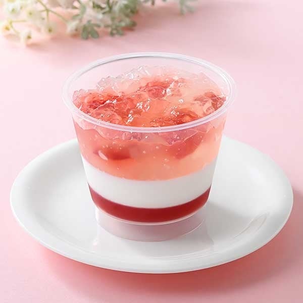 【内容】いちごソース、ミルクムースに、いちごダイスを散らしてその上に桃のジュレを重ねました。混ぜて召し上がっていただくことで、より一層いちご、桃の酸味とミルクムースのまろやかさが楽しめます。