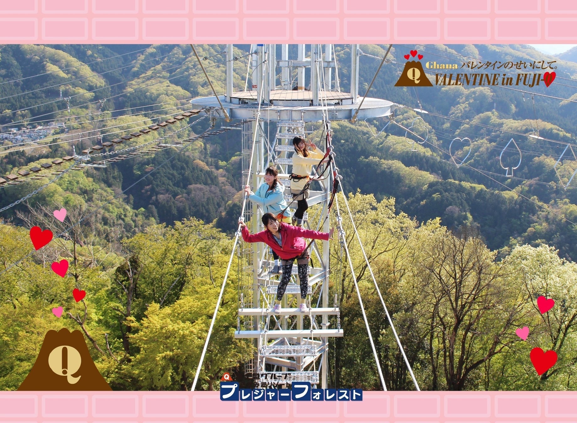 さがみ湖リゾート プレジャーフォレストで人気の大型アスレチック「絶叫吊り橋風天」では、体験中に記念写真が撮れるフォトフレームがコラボバージョンになって登場するほか、フレームのご購入特典として、1グループにつきガーナチョコレートをプレゼントいたします。風天は、標高約370m地点の崖上に設置された最長50mを始めとする8本の長い吊り橋を、命綱を頼りに渡っていくアトラクションで、カップルで体験すれば吊り橋効果も相まって仲が深まること間違いなしです。