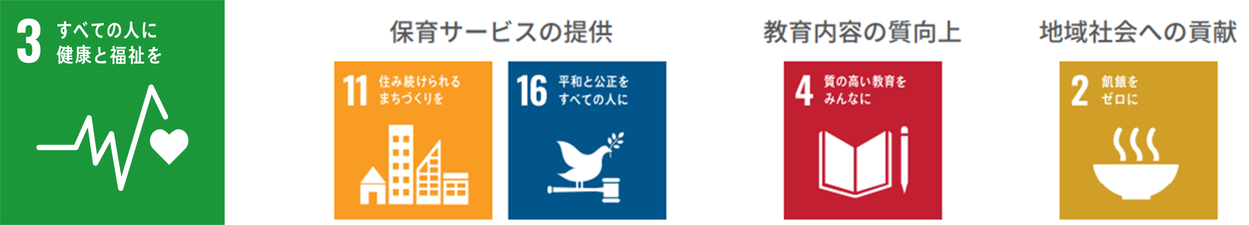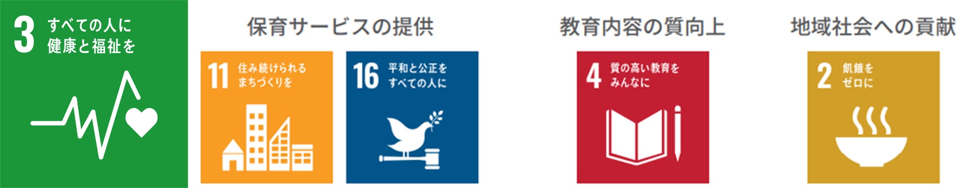 当社では2021年度より「子育てと豊かな社会づくりの星になる。」をスローガンに掲げ、子どもたち、子育てに関わる保護者、保育スタッフまで、子育てに関わるすべての人が「自分らしく生きられる」豊かな社会づくりを目指しています。こうした社会の実現は、いま世界全体で達成すべき目標として掲げられた「SDGs」の目標3「すべての人に健康と福祉を」の実現に貢献すると考えています。当社は目標3への貢献を軸に、「保育サービスの提供」「教育内容の質向上」「地域社会への貢献」の3つの側面からSDGsの達成に貢献し、社会と共にサステナブルな成長を目指します。