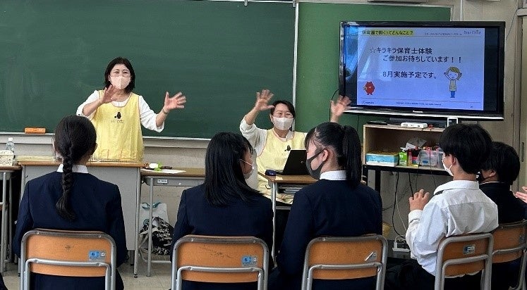 当社では、「未来の保育士を育む応援プロジェクト」として、小学生から高校生までを対象とした保育士無料体験プログラム「キラキラ保育士体験」を、2016年以降、夏休みを利用して実施しています。子どもたちが保育の仕事を志すきっかけとなり、保育業界の発展につながることを目指して取り組んでいます。(募集はHP、ブログ、Instagramにて)