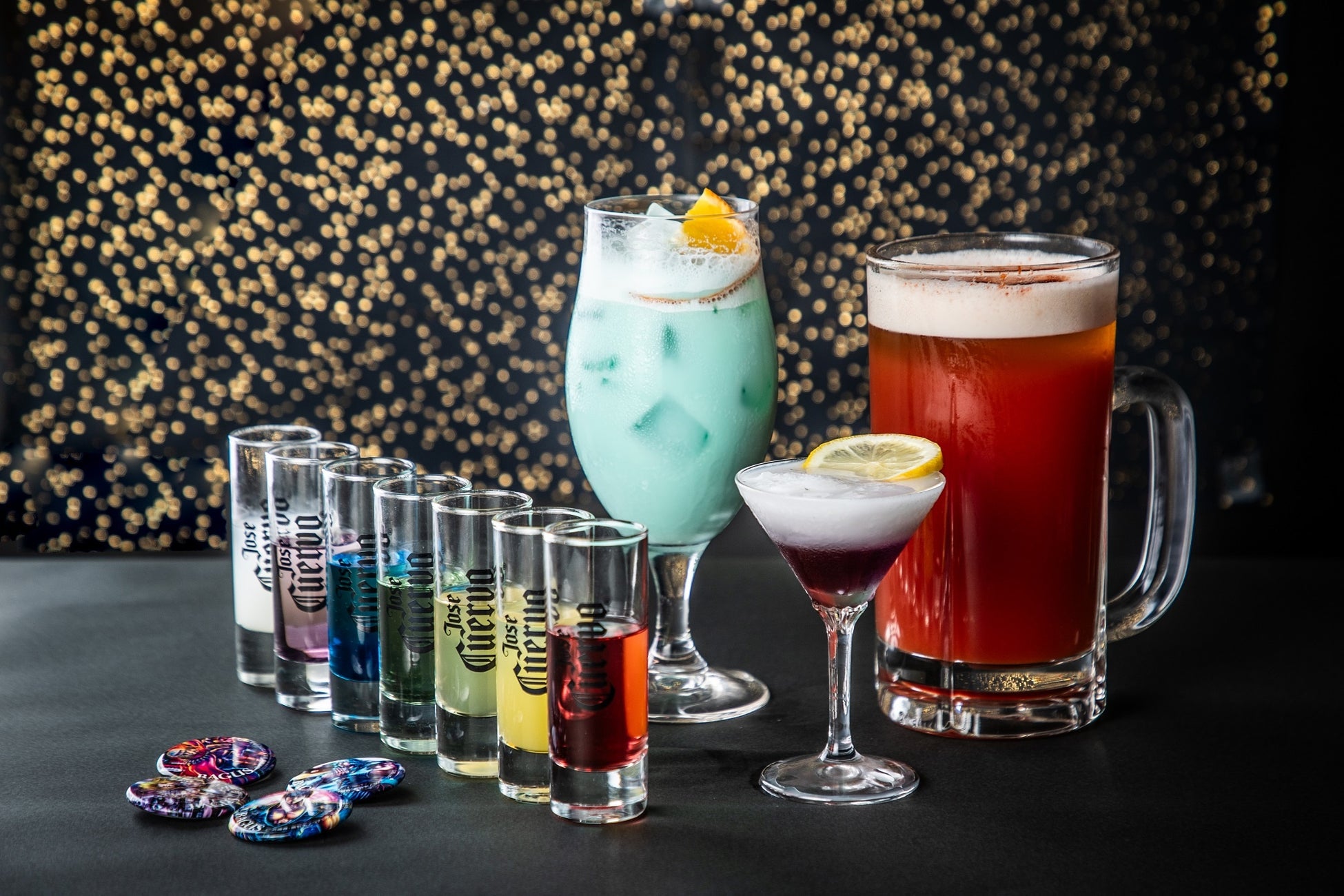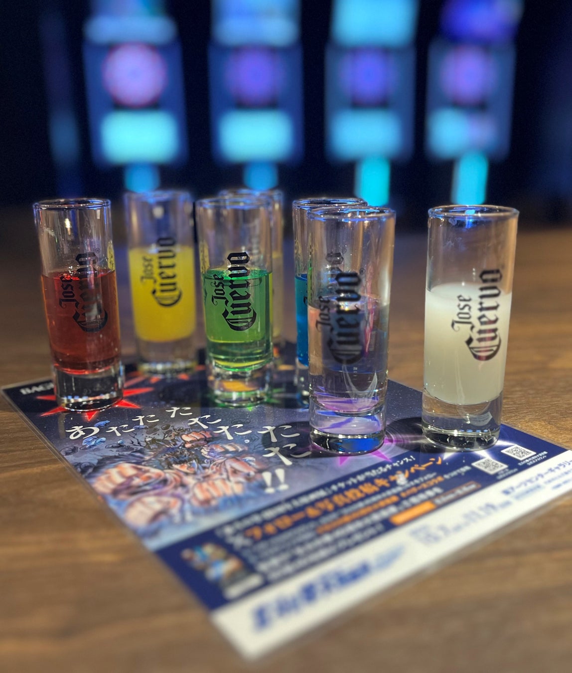 BAGUSの定番、テキーラショットをレインボーカラーで販売。ケンシロウの胸の7つの傷を表現したシートに並べ提供いたします。7ショットご注文の方はレアバージョン以外の缶バッチ4種を進呈いたします。是非お仲間でショットのコンプリートにTRYしてみてはいかがでしょうか?