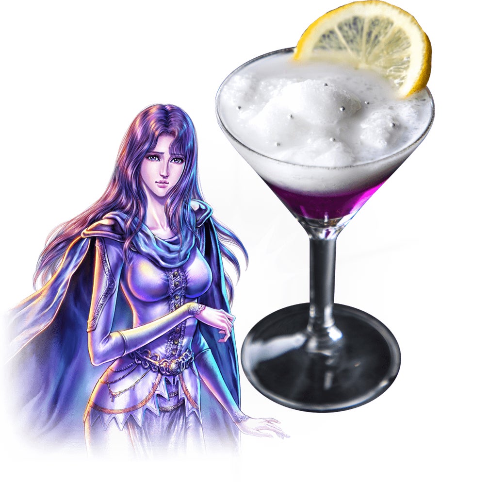ラベンダー由来の華やかなリキュールにヨーグルト風味のフローズンをふんわり重ね、ユリアの美しく儚げな姿を表現。ユリアの優しい愛に包まれるような心安らぐ癒しのカクテルです。