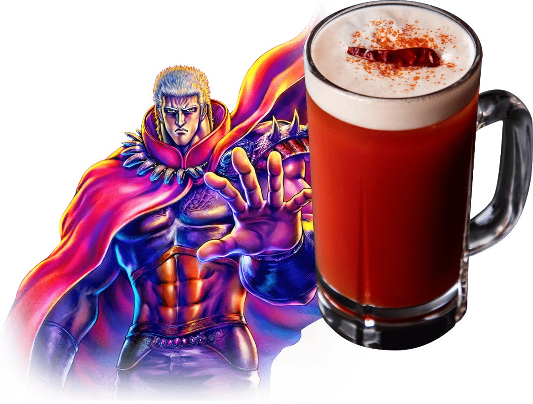 ラオウの巨体を思わせる豪快なBIGジョッキを使用。ジョッキを傾けるだけでラオウのような不敵な気分を味わえます。ビールをトマトジュースで割ったカクテル「レッドアイ」に唐辛子を加え、ラオウの燃える魂を注入。ジョッキを天に突き上げれば、かの有名なシーンを彷彿とさせる、まさに“この夜に一片の悔いなし”