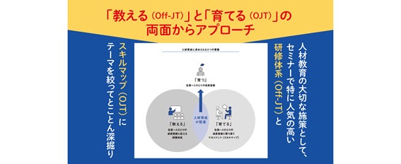 人材教育施策に大切なのは「Off-JT=教える」と「OJT=育てる」の両面からのアプローチです。本書では、Off-JTでどんな研修を実施するのかという研修体系の構築について、また、OJTを効果的に促進させるツールとして、スキルマップの策定プロセスや運用の仕方について詳しく説明しています。