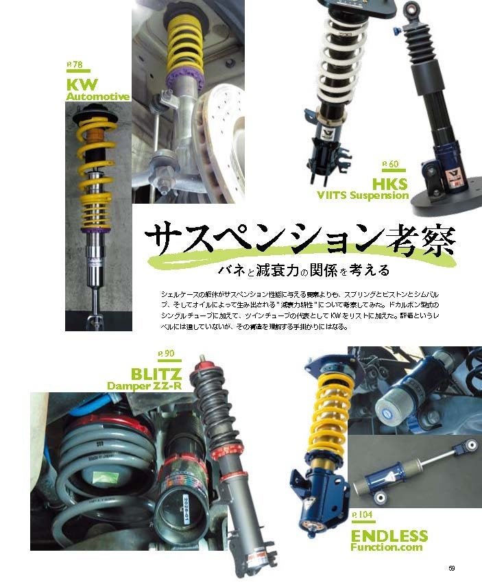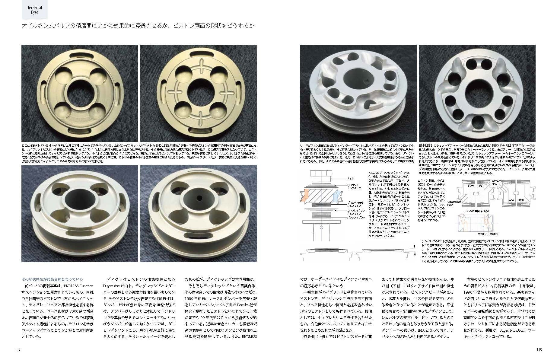 これはピストンの“深堀記事”ページの一部です。穴形状の違いにより、シムバルブとの密着度と、それにともなうオイルが流れ方が違ってくることを紹介しています。ショックアブソーバーのキーテクノロジーはピストンの形状にあります。シェルケース内を音速に近い速度でオイルが流れているわけですが、その制御方法によって減衰力は違ってきます。各メイクスのインプレッションも併載。理論と実践の両面からの誌面構成となっています。