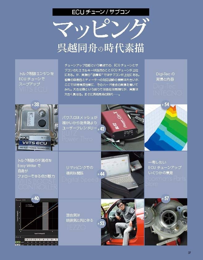 アバルトを自分流にモディファイすること=チューニングアップ。こんな風に考えることがこのムックの編集基調です。パワーユニット/フットワーク/ブレーキ、この三大要素をメカニズム視点で紹介していきます。単純に“モノの紹介”に終わることなく、チューニングアップの対象パーツの構造や効果にも触れています。目次をご覧になっても、その編集基調は分かっていただけると思います。
