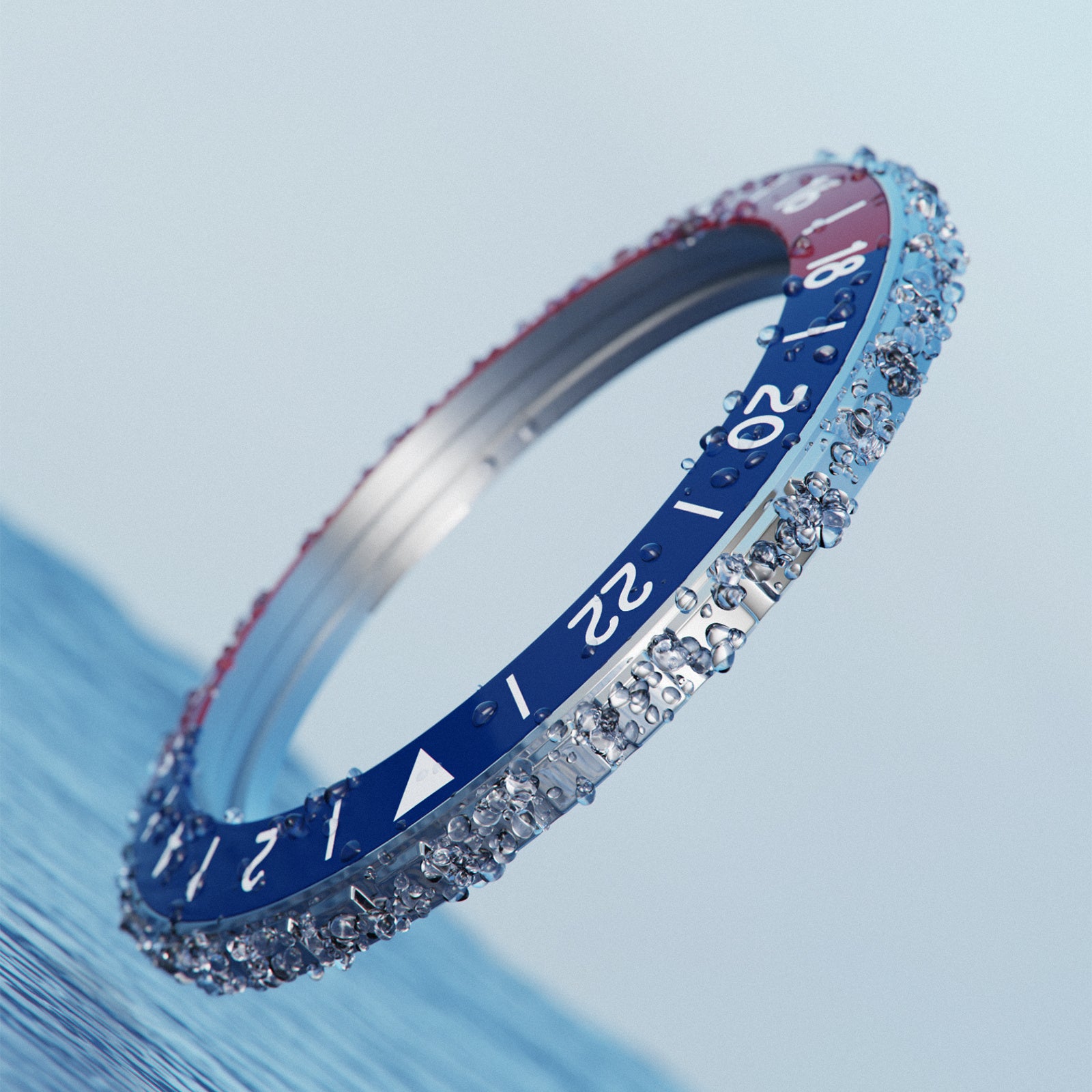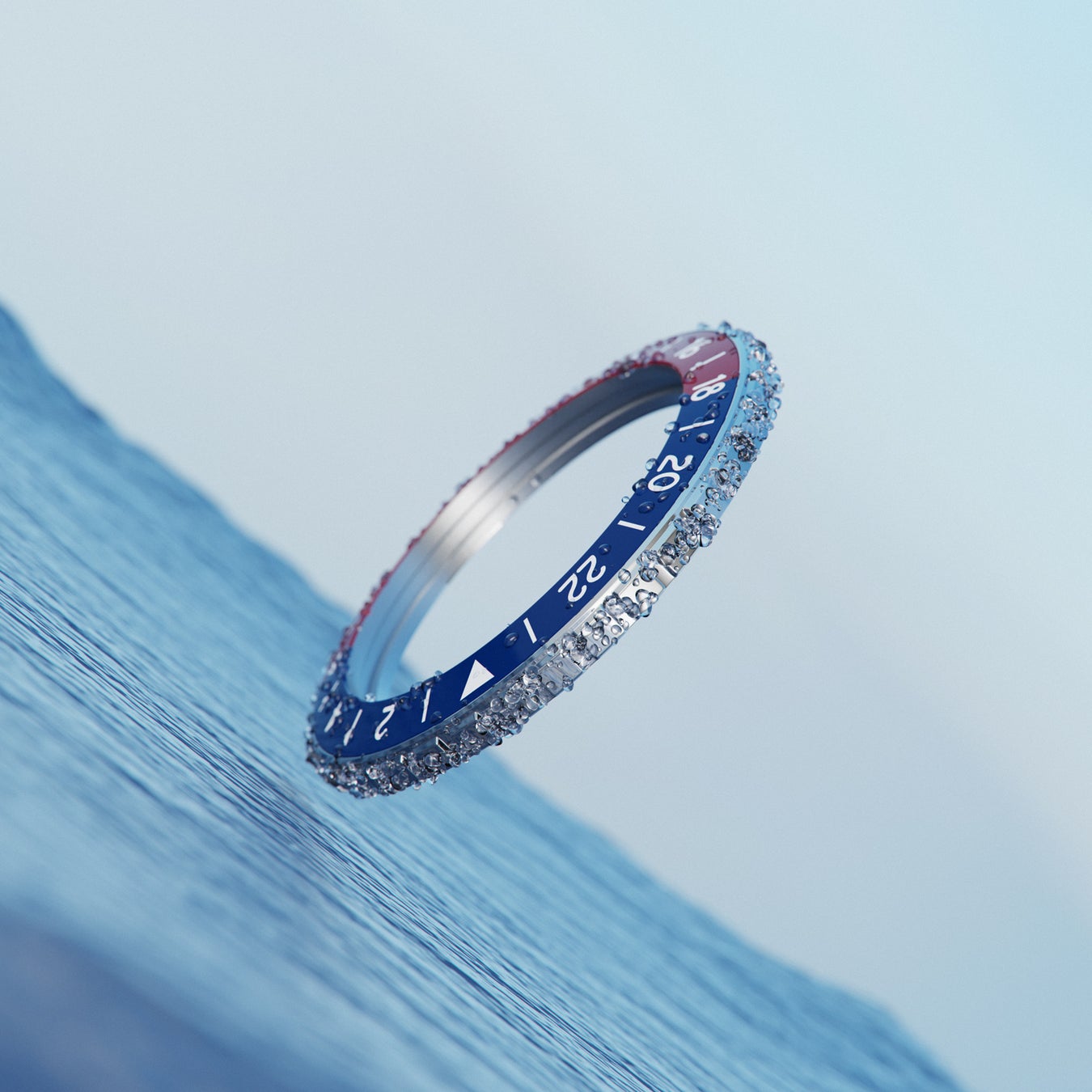 ベゼルには24時間目盛を刻印。華やかな印象与えるバイカラーは昼夜を表したもので、求める地域の今を視覚的に捉えることが可能に。またベゼルは双方向に回転し、第3の時間帯の現在時刻も把握できます。