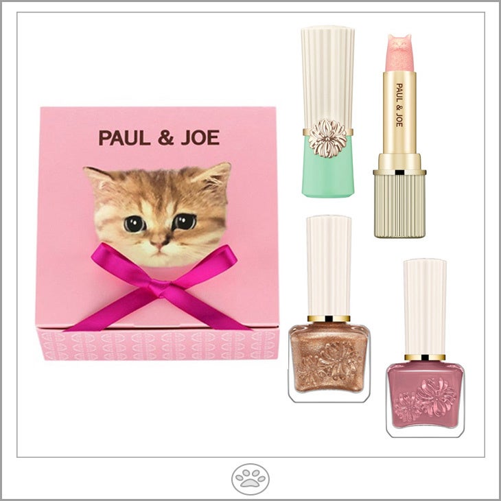 お好みのカラーに重ねれば、パールの輝きで立体的で華やかな唇を演出するリップ。ひと塗りでつややかな爪に仕上げるネイルカラー。「ポール & ジョー」デザイナーのソフィーが愛する猫・ヌネットをデザインした、特別なギフトボックスに入れて♪
