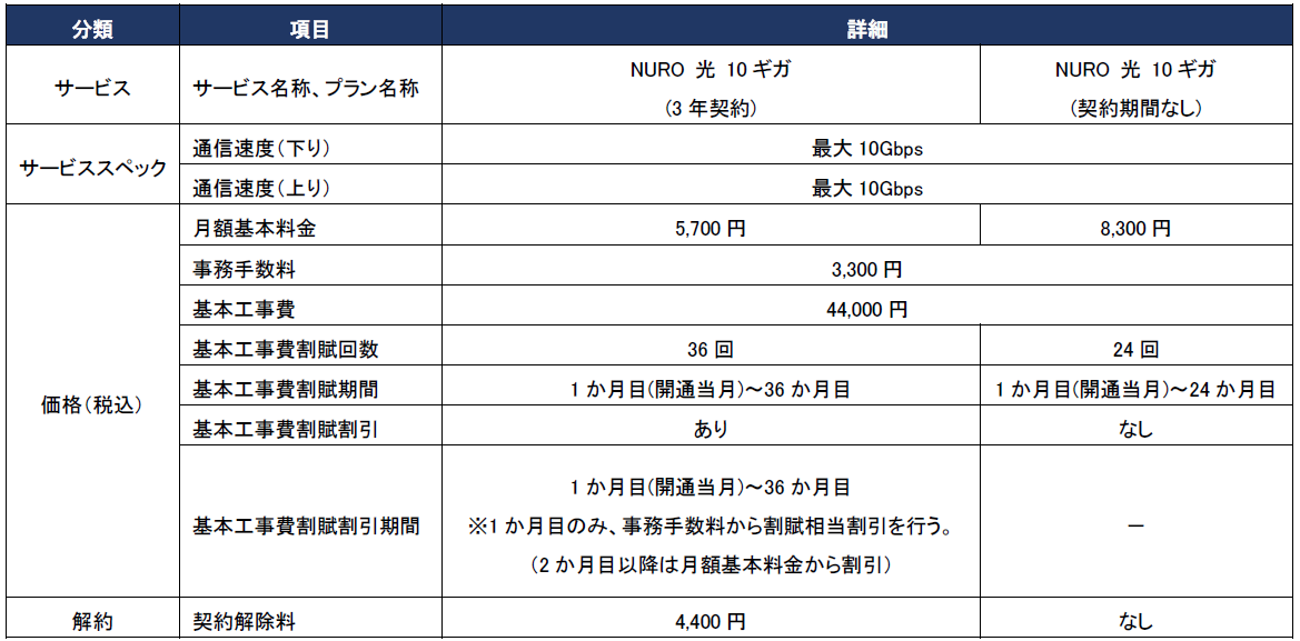 広島県においては、2021年よりNURO 光 2ギガプランを提供してきました。このたび新たに、NURO 光 10ギガの提供を開始し、最大通信速度が上り/下りともに10Gbpsの高速・大容量サービスをリーズナブルな価格で提供します。一例として、NURO 光 10ギガ(3年契約)プランの場合、月額基本料金は5,700円です。また、初年度の月額基本料金が980円となる特典なども適用します。
