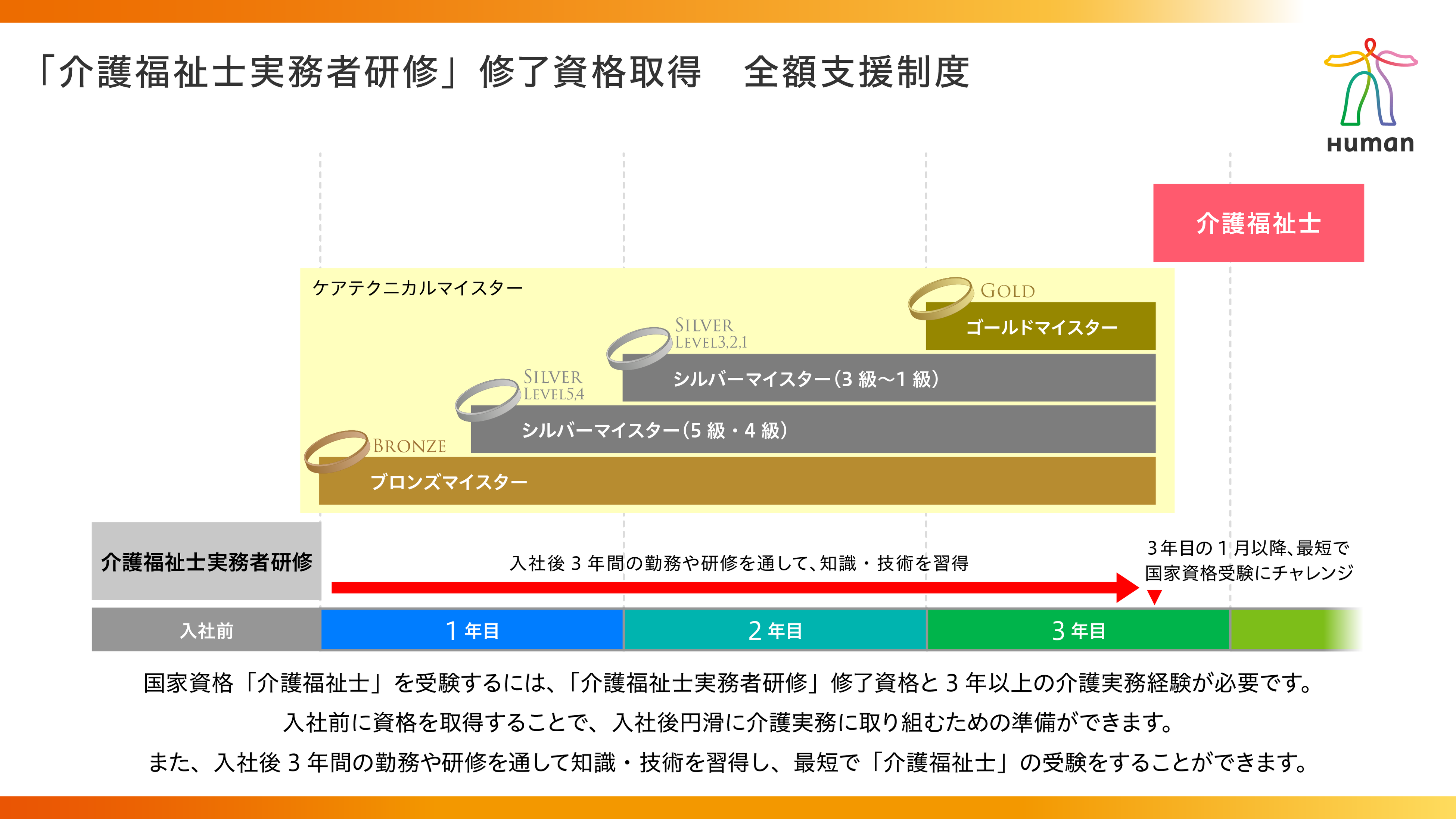 当社はこれからも、介護のプロを育成しながら、一人ひとりが希望するキャリア構築を実現できる環境づくりを行い、ヒューマングループの経営理念である「SELFing(自分発見・自分開発)」を通じて、介護業界で“なりたい自分”を実現できる体系的な人材育成を目指してまいります。