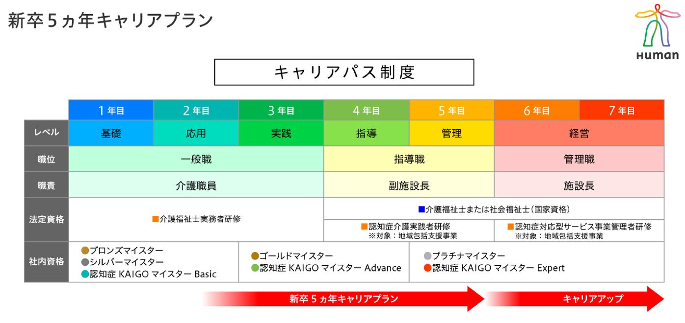 当社は、介護技術やその技術を指導するスキルを身に付けるための「ケアテクニカルマイスター」制度や、認知症の正しい理解や対応技術を習得し、より良い認知症ケアの提供や虐待を防止することを目的とした「認知症KAIGOマイスター」制度など、介護技術の習得やスキルアップを目的とした社内資格制度を設けており、加えて、キャリアパスを明確にし、一人ひとりが目標や適性に合わせてキャリアアップを目指すための「新卒5カ年キャリアプラン」制度を推進しております。
