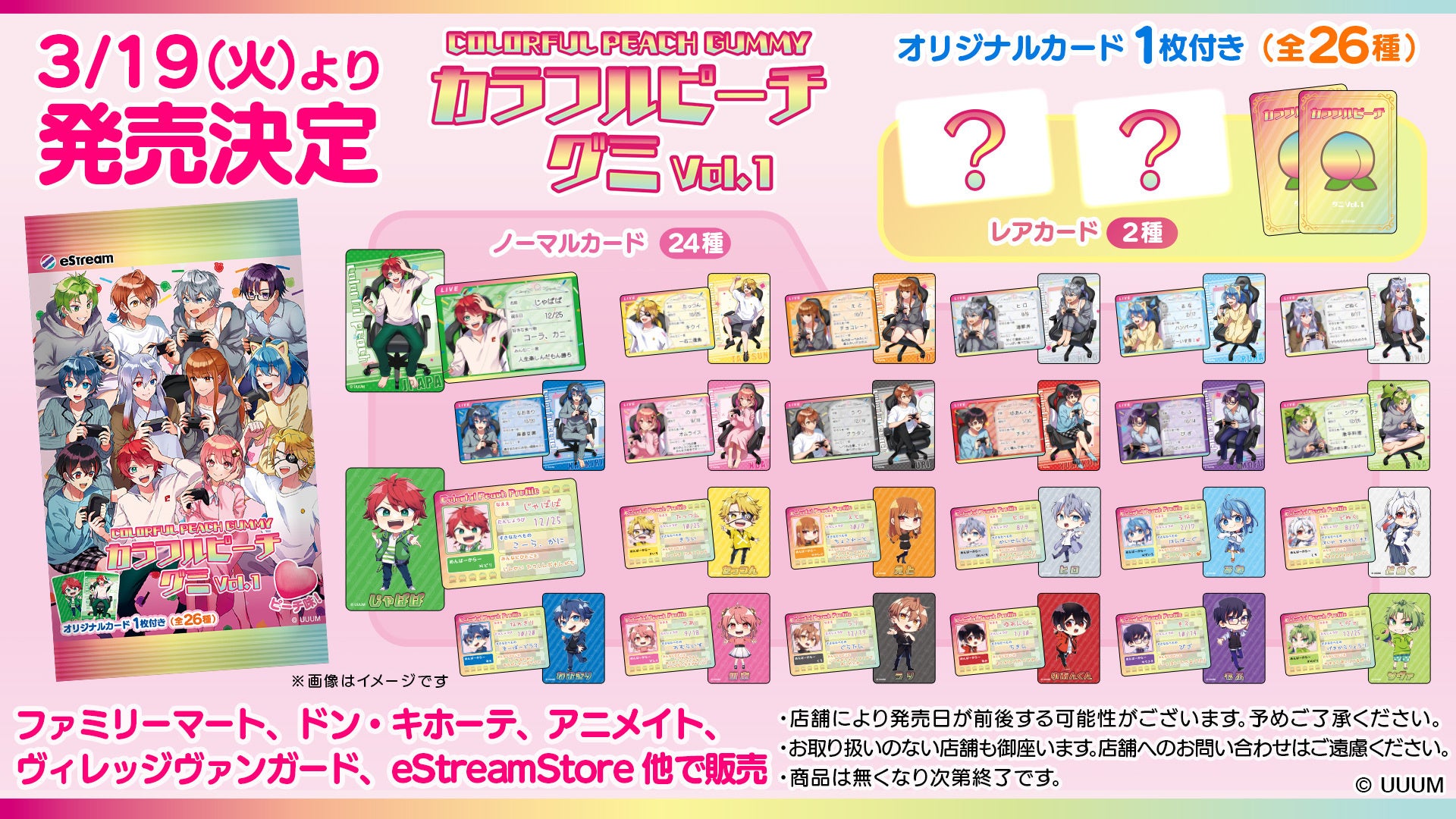 株式会社CyberZ(本社:東京都渋谷区、代表取締役社長:山内隆裕)の連結子会社、株式会社eStream(本社:東京都渋谷区、代表取締役社長:高井里菜)は、大人気動画クリエイター「カラフルピーチ」とコラボし、オリジナルカードがおまけで1枚付いてくる『カラフルピーチグミ vol.1 ピーチ味』の発売を決定いたしました。2024年3月19日(火)より、全国のファミリーマート店舗、eStream Store他にて販売いたします。