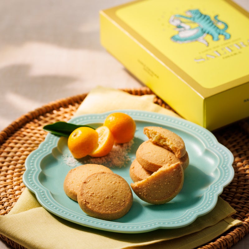 北海道でつくられたゴーダチーズに宮崎県産金柑のペースト、淡路島の藻塩を練り込み焼き上げたサクサクのサブレ。