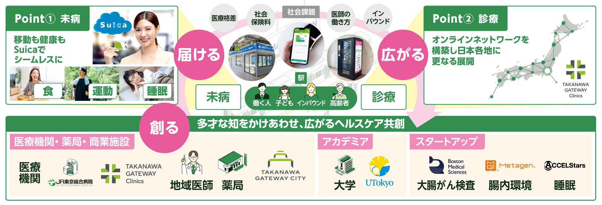 JR東日本グループは、生活動線上にある「駅」や生活のデバイスへと進化する「Suica」を起点に、オンラインを活用した予防から診療、診療後までのトータルヘルスケアサービスを提供する「スマート健康ステーション®」の展開を通じて、受診したいときに受けられないといった“医療格差”や“医師の働き方改革”等の社会的な課題解決に貢献します。