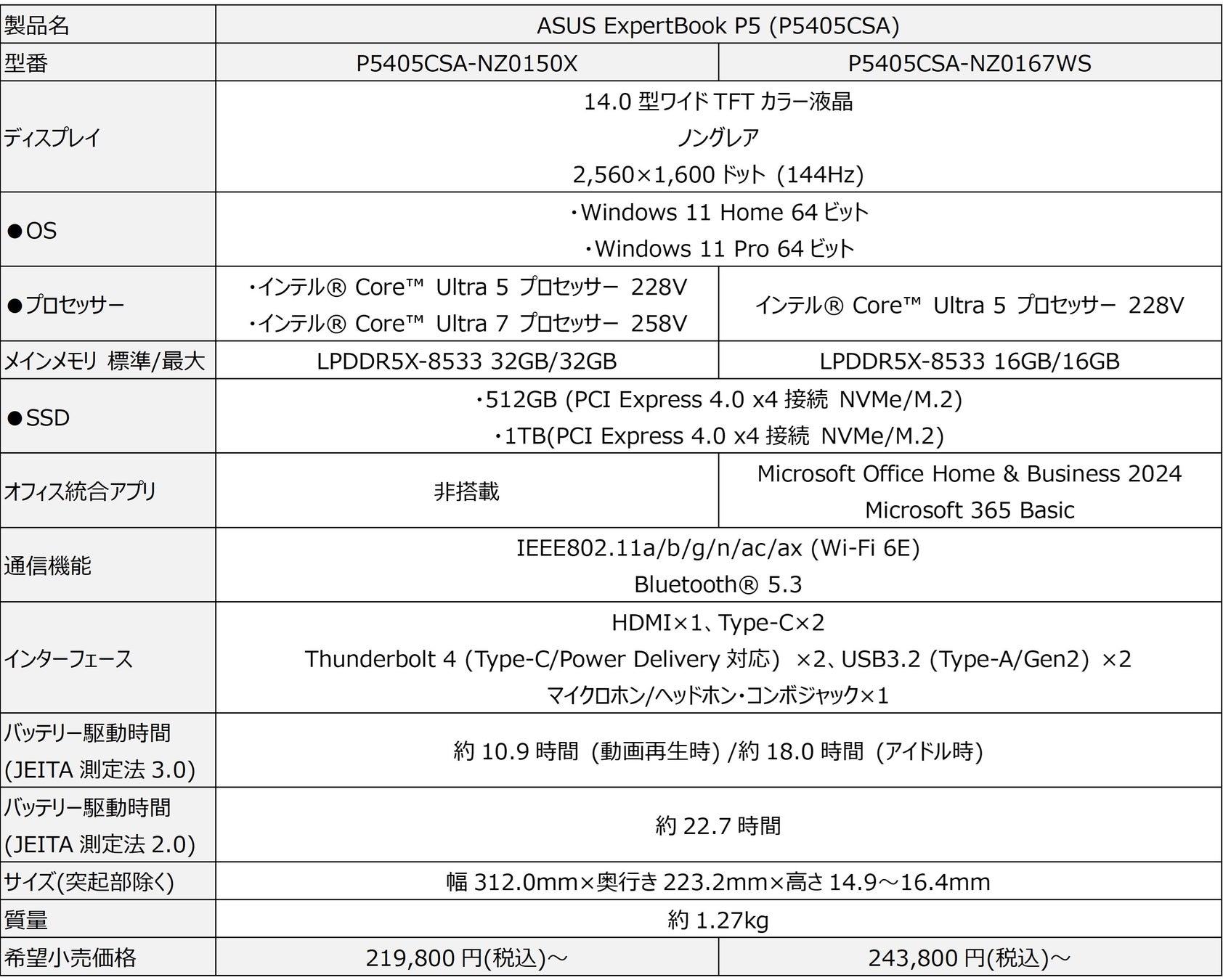 製品詳細プレスリリース:ASUS初のビジネス向けCopilot+ PC「ASUS ExpertBook P5 (P5405CSA)」を発表 ビジネスシーンで役立つASUS独自のAIツール「ASUS AI ExpertMeet」も搭載