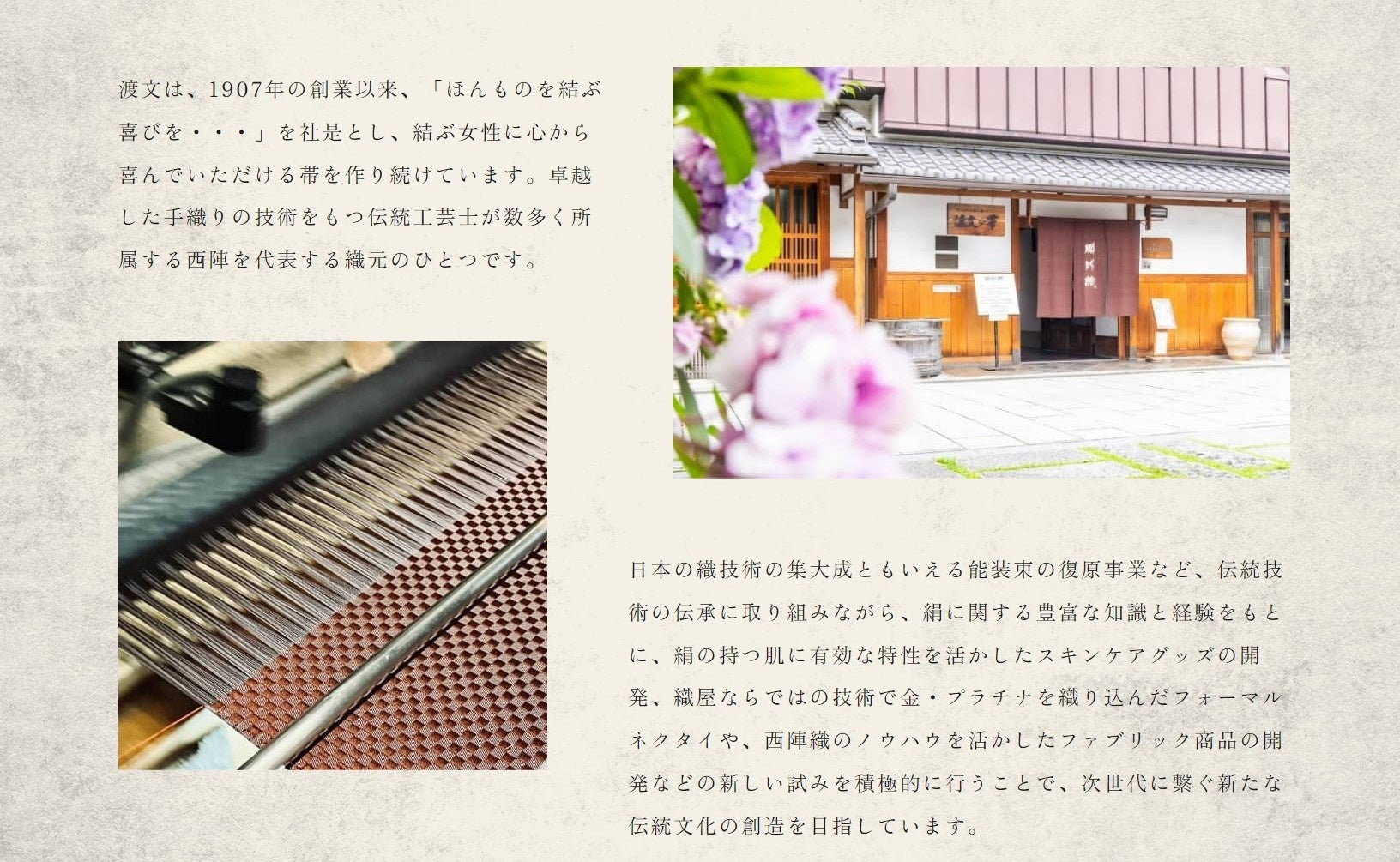 また、ベルトには1907年に創業し、卓越した手織りの技術をもつ西陣織の名門、京都・『渡文』